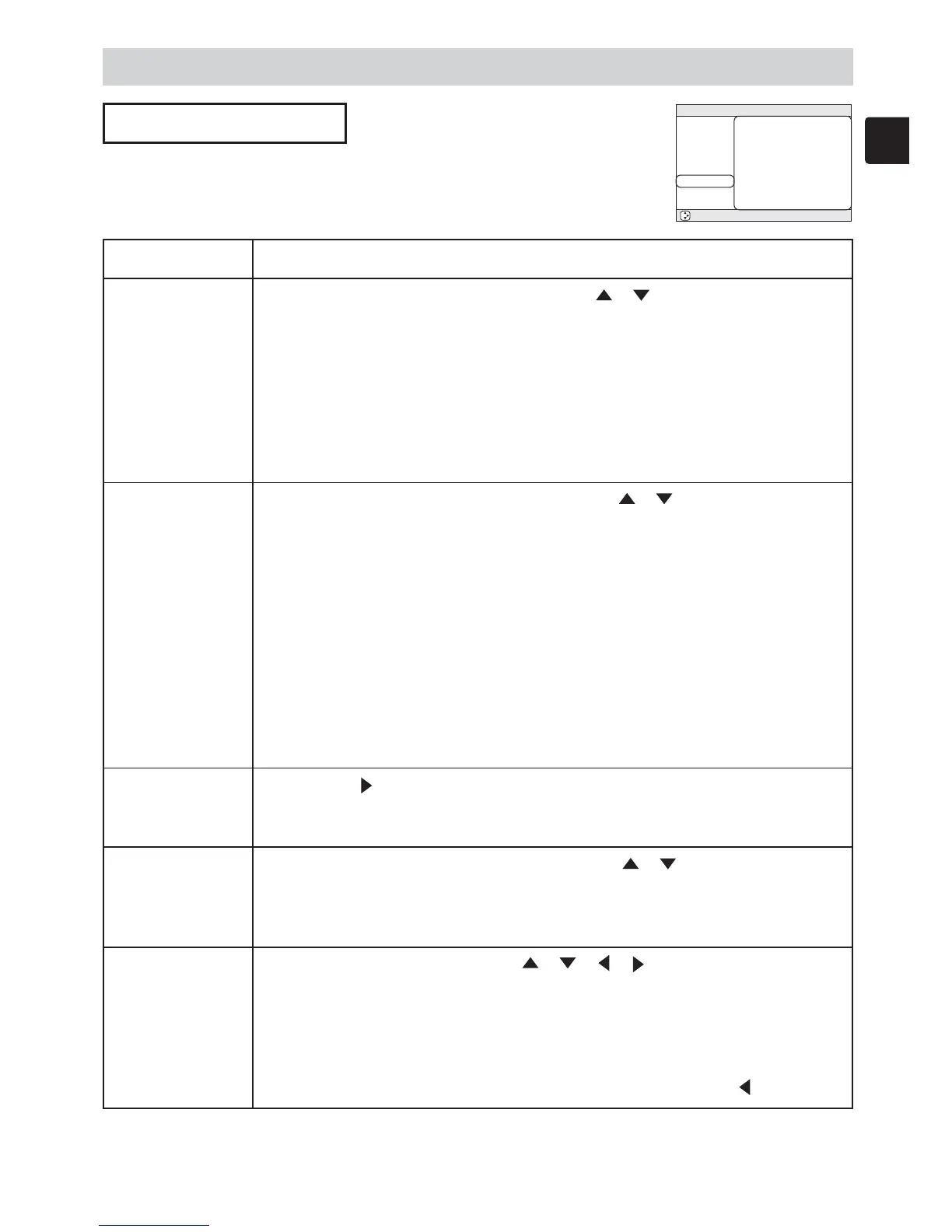With the SCREEN menu, the items shown in the table below can be