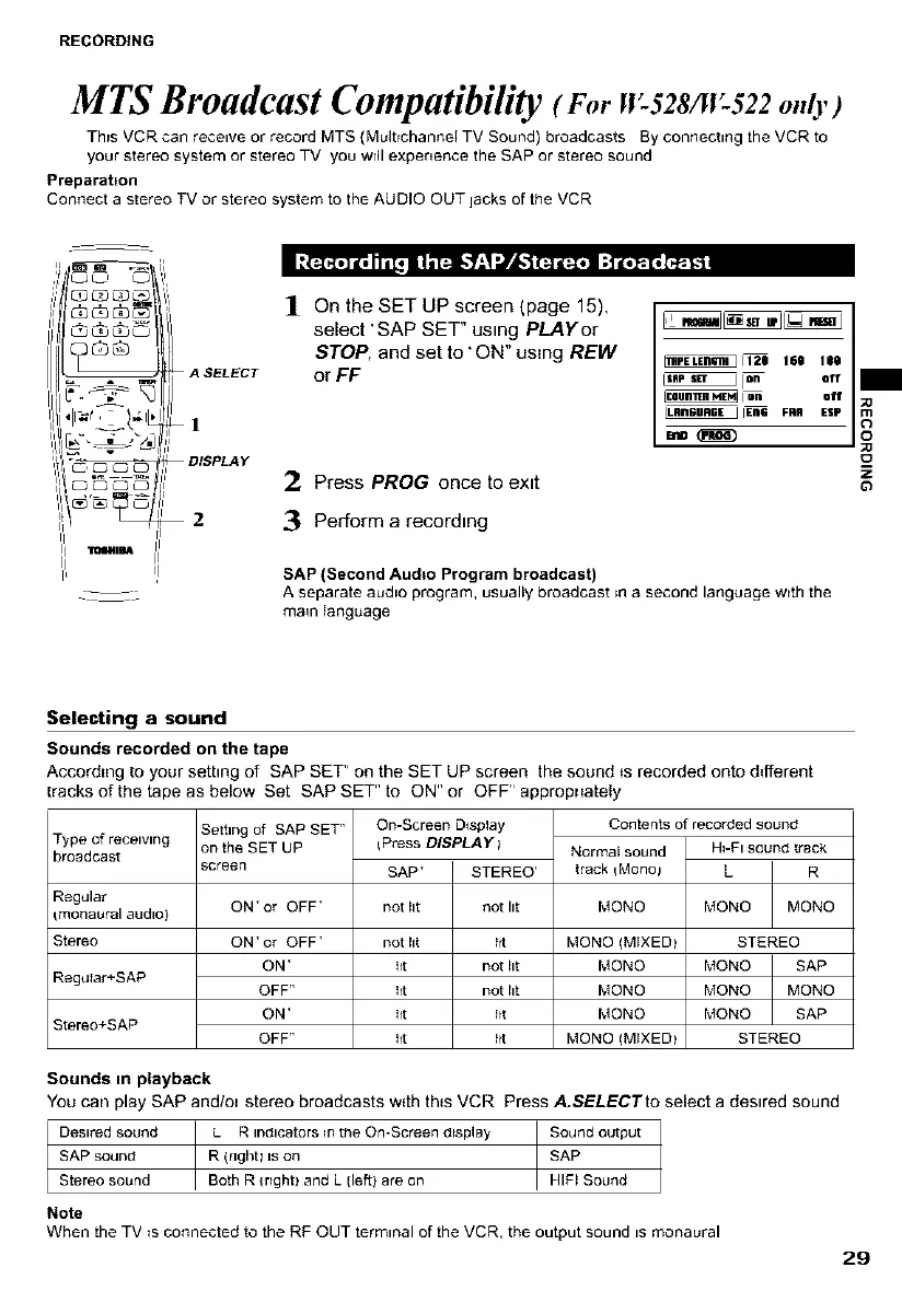 You can play SAP and/or stereo broadcasts wdh th_s VCR Press A.SELECTto select a desired sound