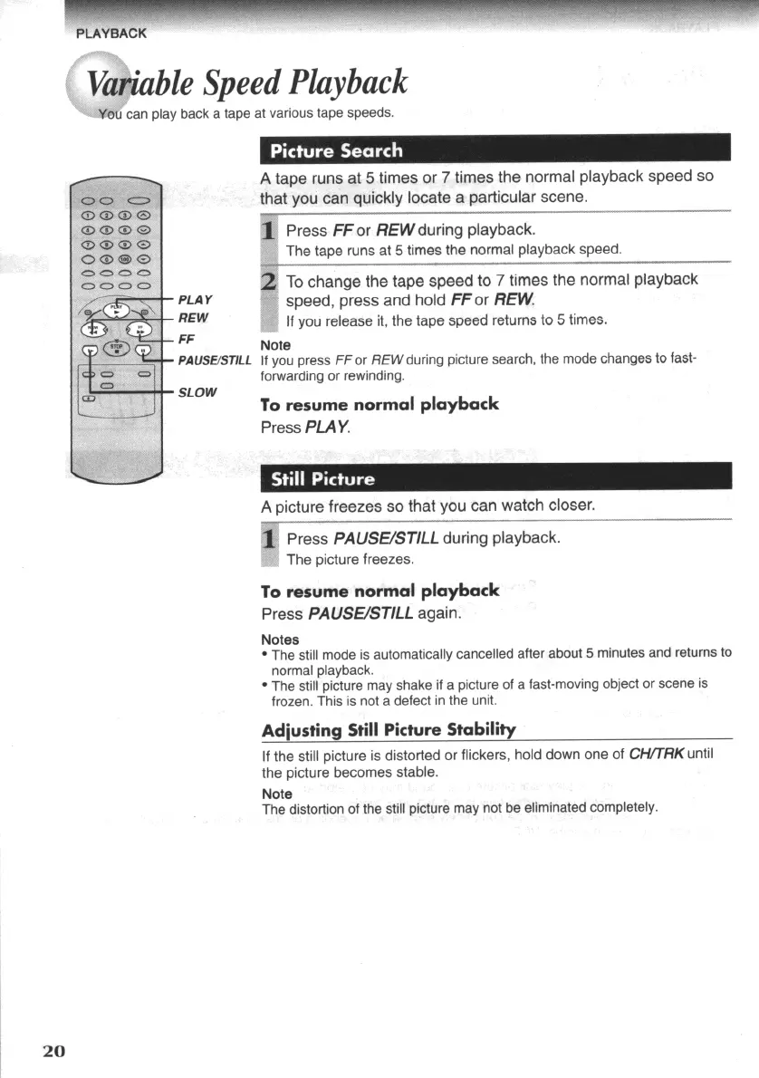 Toshiba W602 - Variable Speed Playback; Picture Search; Still Picture; Adjusting Still Picture Stability