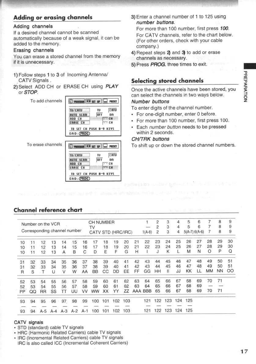 Toshiba W607 - Adding or Erasing Channels; Selecting Stored Channels; Channel Reference Chart