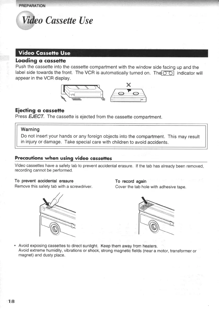 Toshiba W607 - Video Cassette Use; Loading a Cassette; Ejecting a Cassette; Precautions When Using Video Cassettes