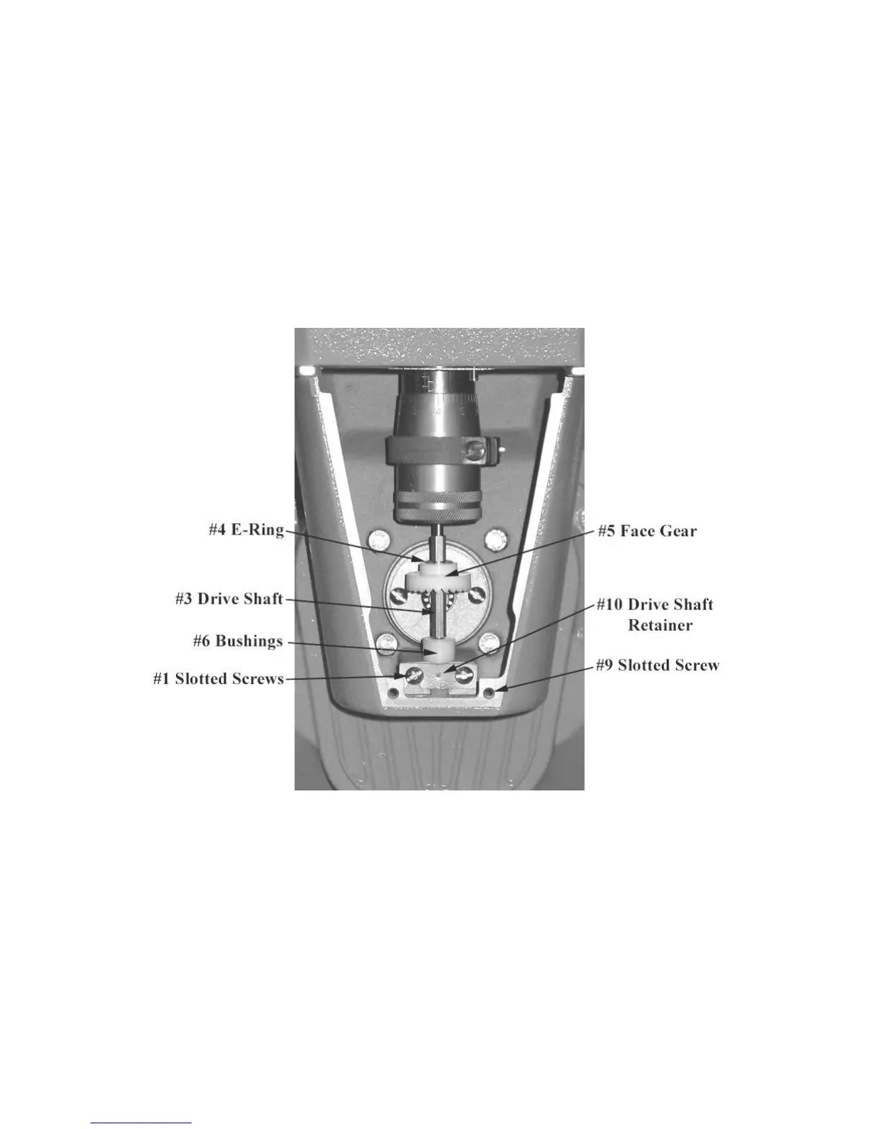 bushings (#6), the drive shaft (#3), the e-ring (#4) and the face gear (#5). Reinstall the gear on the shaft