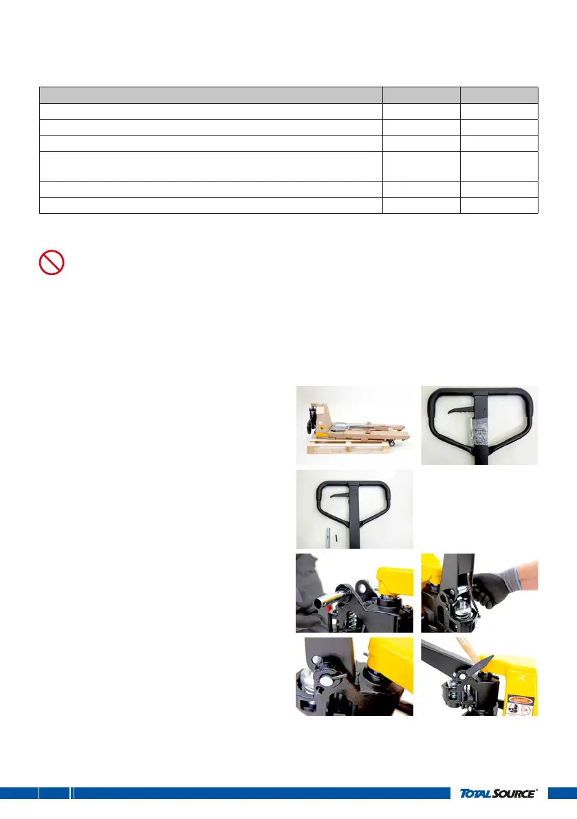 • Wear safety gloves and safety shoes when assembling the pallet truck.