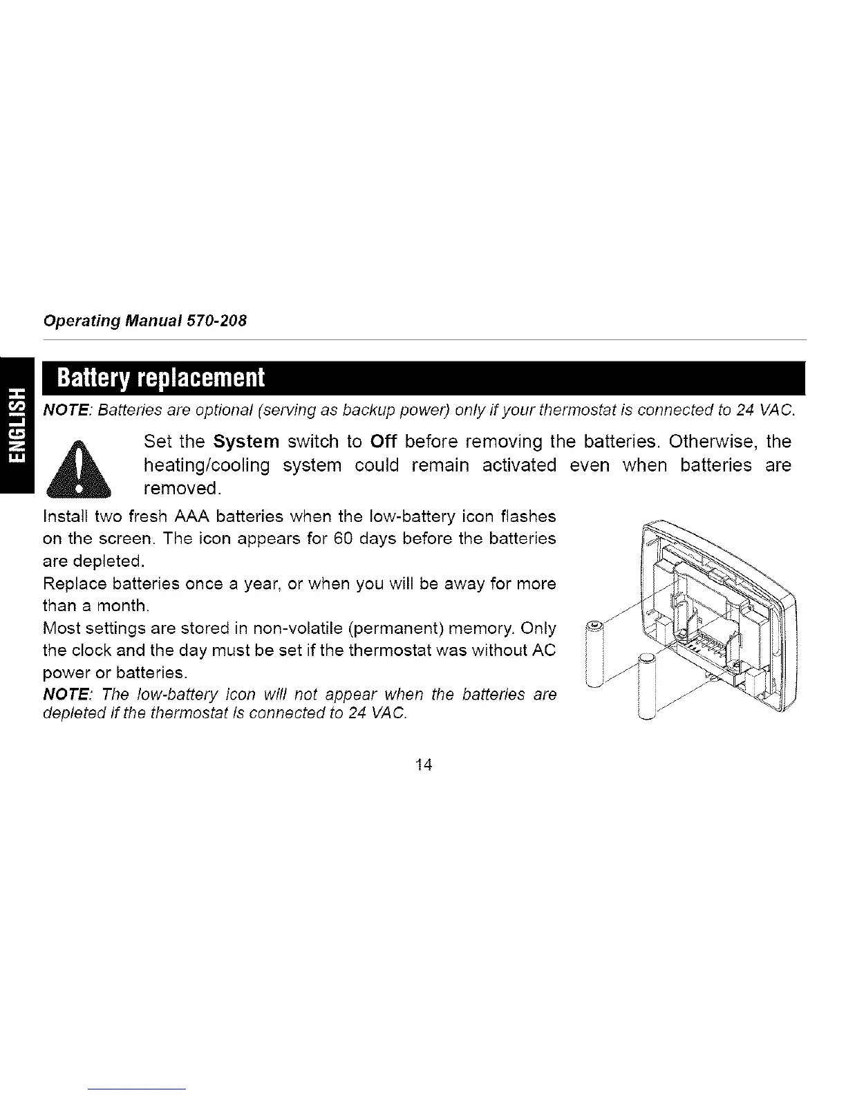 NOTE: Batteries are optional (serving as backup power) only if your thermostat is connected to 24 VAC.