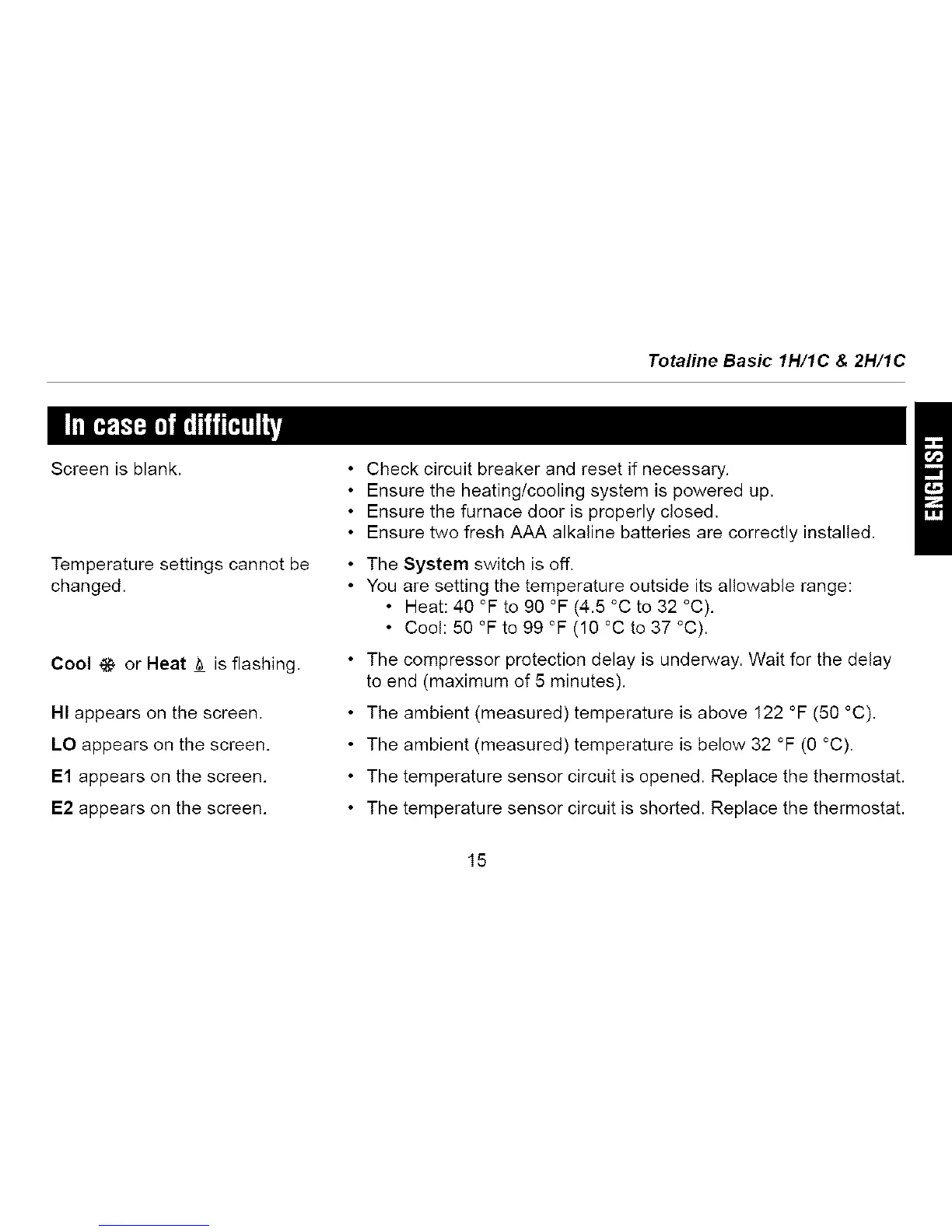 • Heat: 40 °F to 90 °F (4.5 °C to 32 °C).