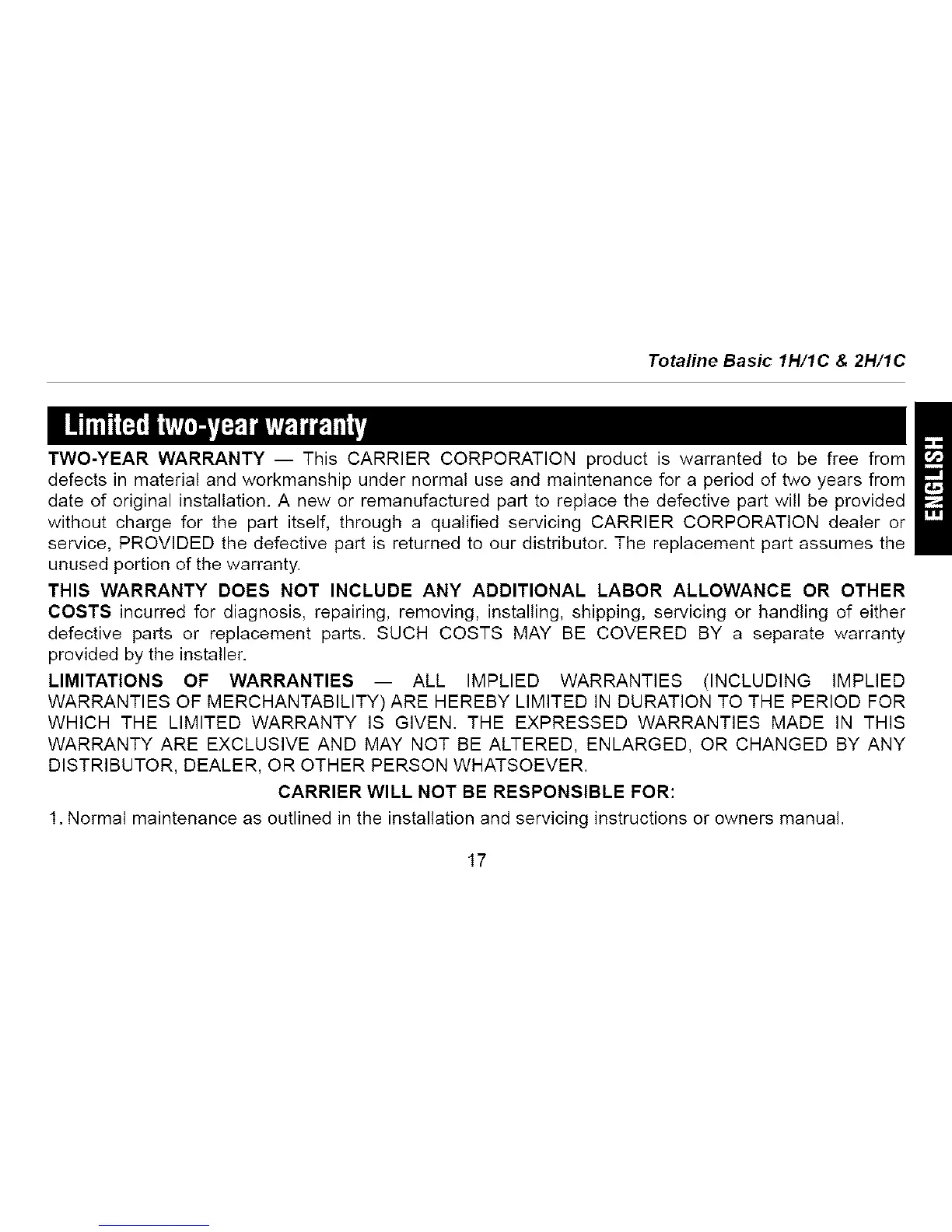 TWO-YEAR WARRANTY -- This CARRIER CORPORATION product is warranted to be free from