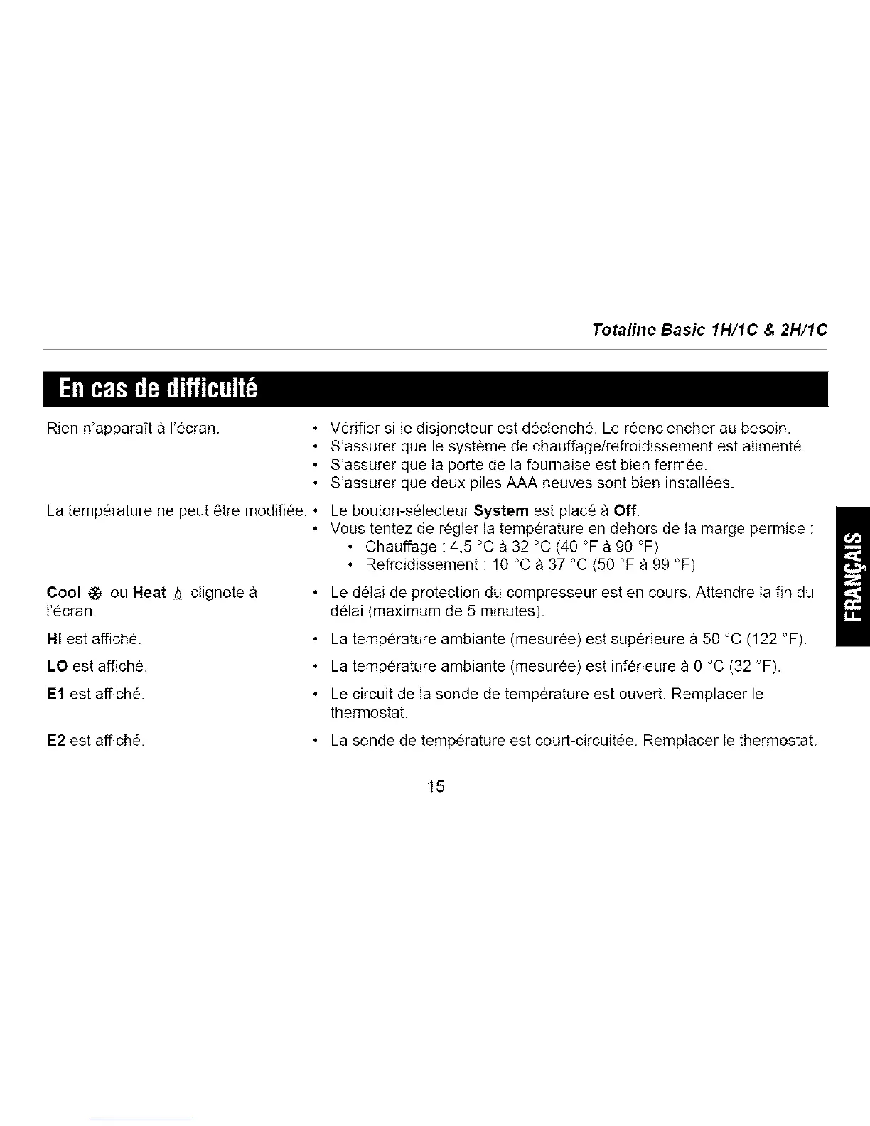 • Chauffage :4,5 °C a 32 °C (40 °F a 90 °F)