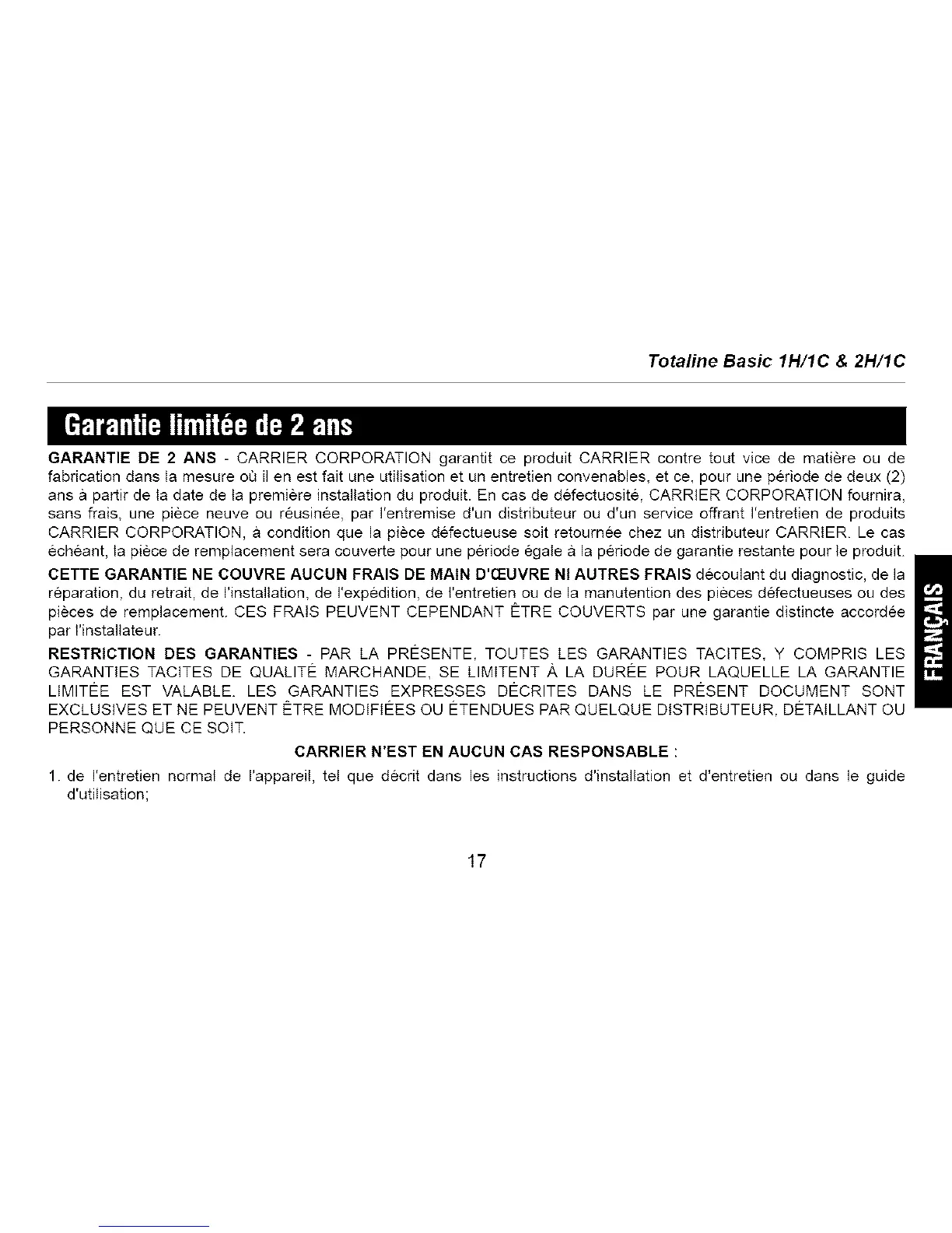 GARANTIE DE 2 ANS - CARRIER CORPORATION garantit ce produit CARRIER contre tout vice de mati@e ou de