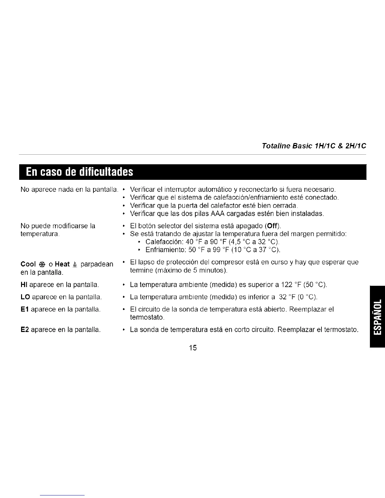 • Calefaccidn: 40 °F a 90 °F (4,5 °C a 32 °C).