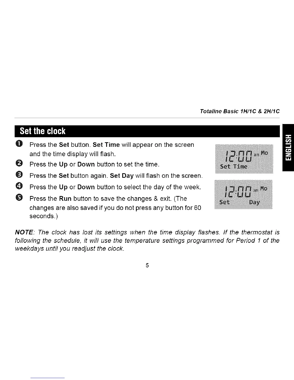 NOTE: The clock has lost its settings when the time display flashes. If the thermostat is