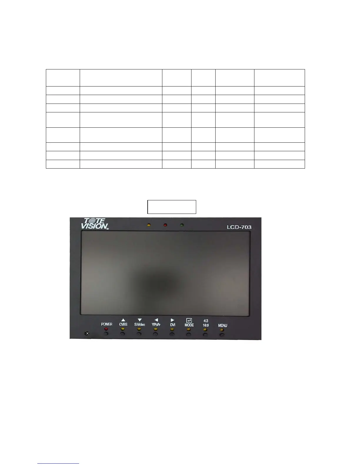 CVBS, S-Video, YPrPb and DVI select input source and LED on when active.