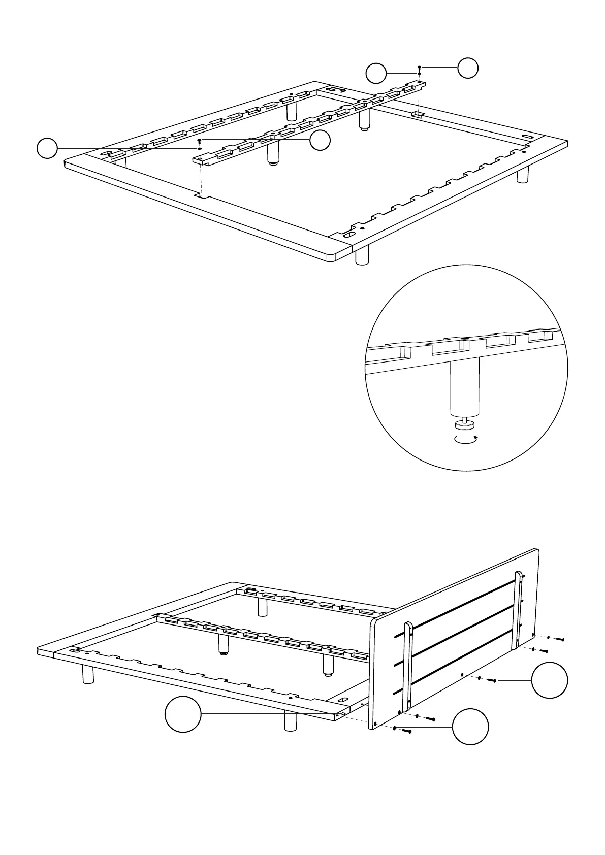 Install 2x dowels (H) to the bed frame, then install the headboard (9) using 5x bolts (D) and 5x