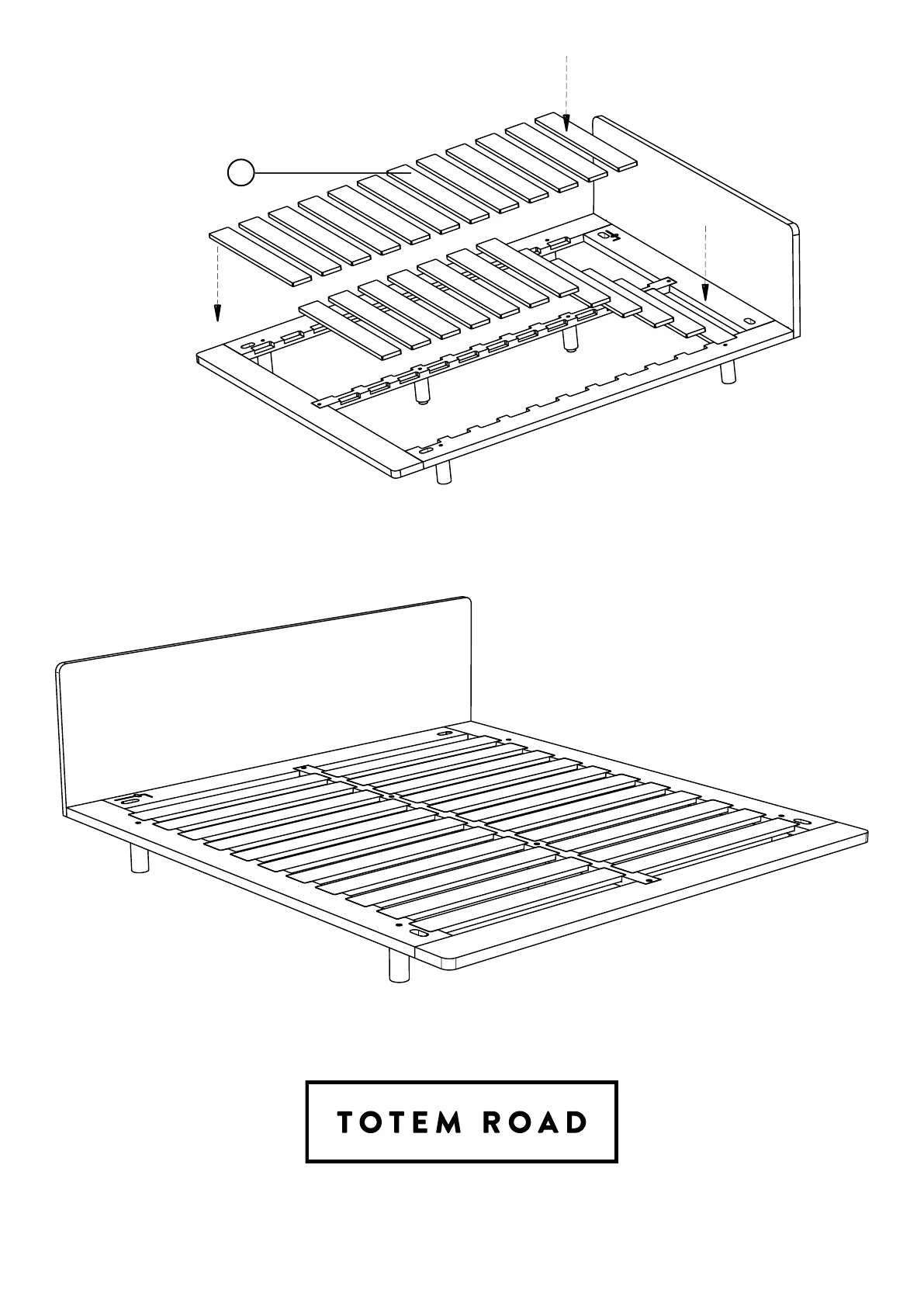 Fit the slats (6) by simply placing them onto the slots on the bed frame.