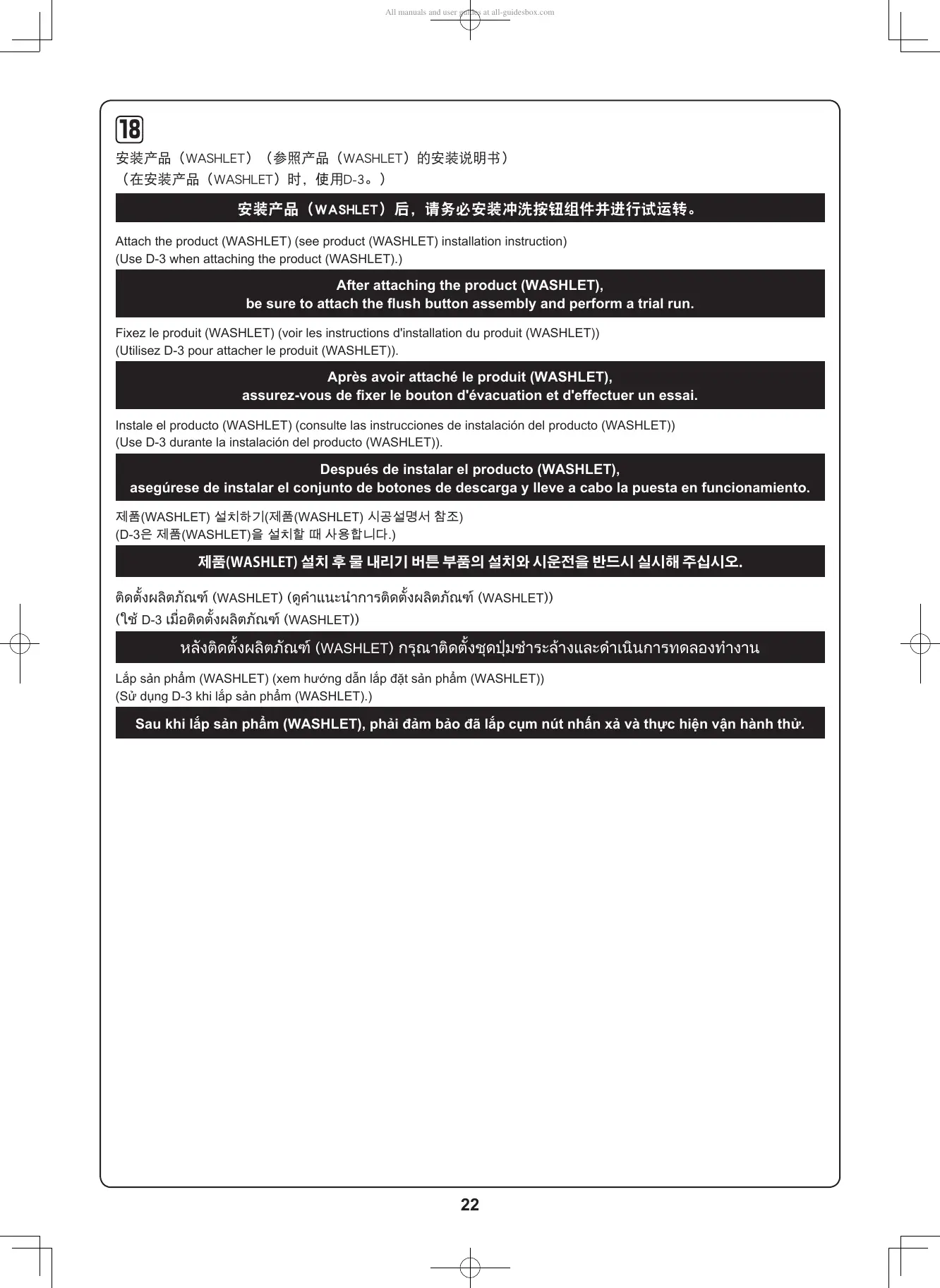 제품(WASHLET) 설치 후 물 내리기 버튼 부품의 설치와 시운전을 반드시 실시해 주십시오.