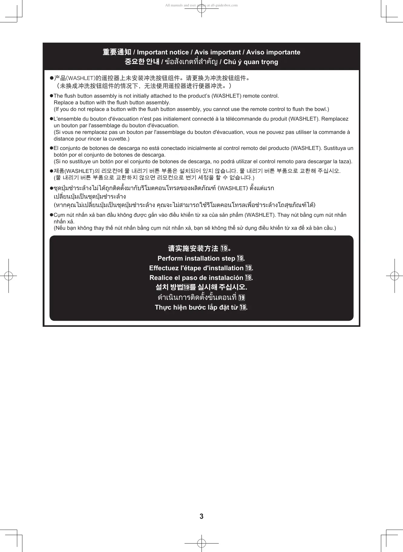 z产品(WASHLET)的遥控器上未安装冲洗按钮组件。请更换为冲洗按钮组件。