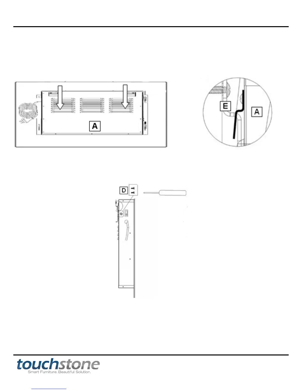 2. Secure the fireplace to the wall bracket with the 2 screws (D), one on each side, removed from the mounting
