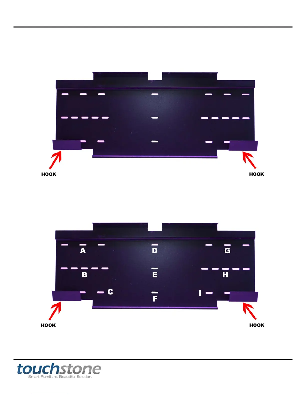 anchors. The hooks in the bracket MUST be pointed away from the wall, upward, and level.