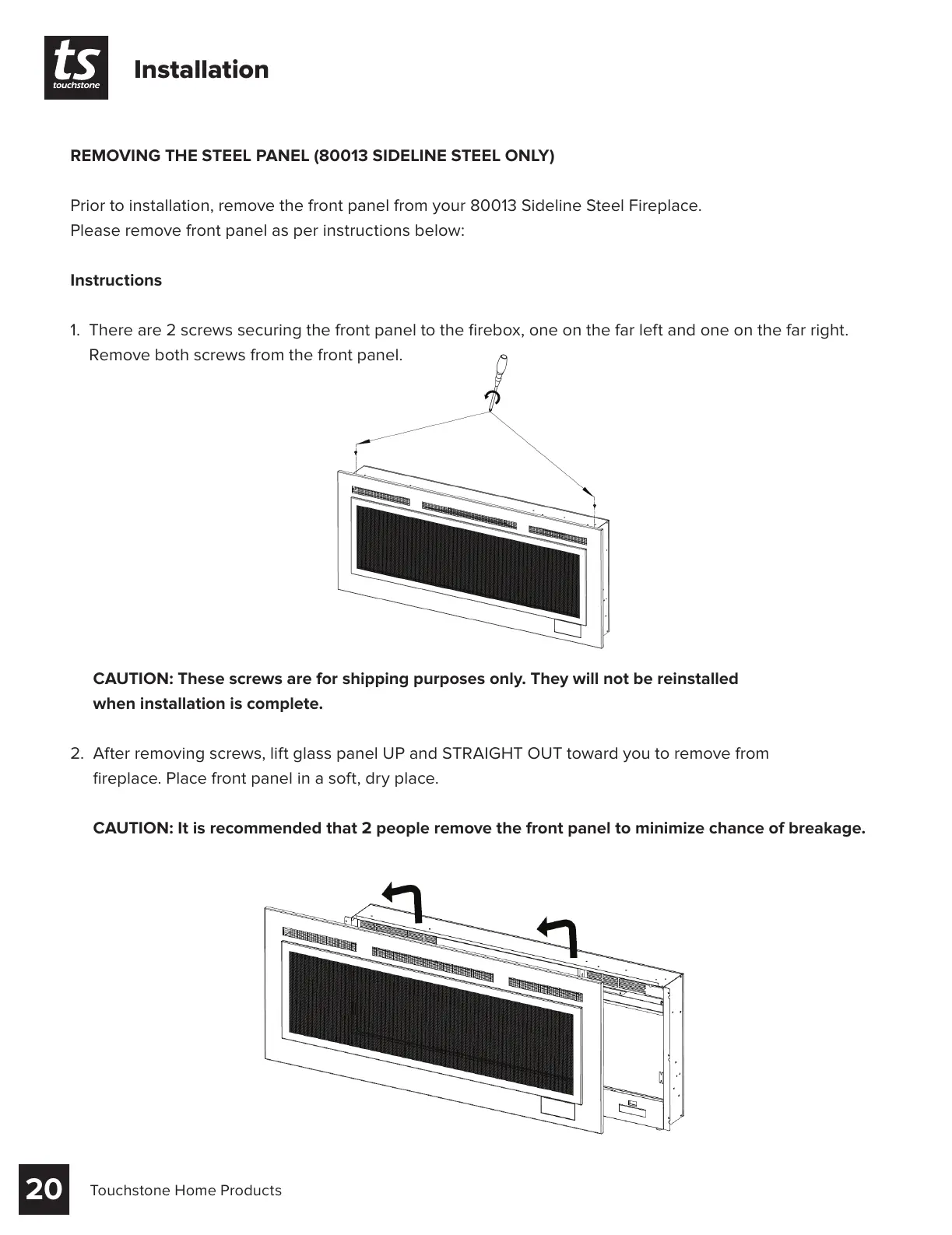 Prior to installation, remove the front panel from your 80013 Sideline Steel Fireplace.