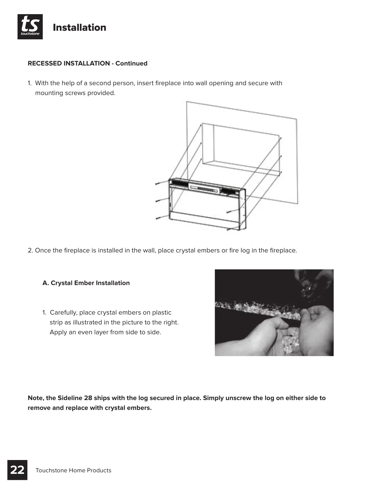 2. Once the fireplace is installed in the wall, place crystal embers or fire log in the fireplace.