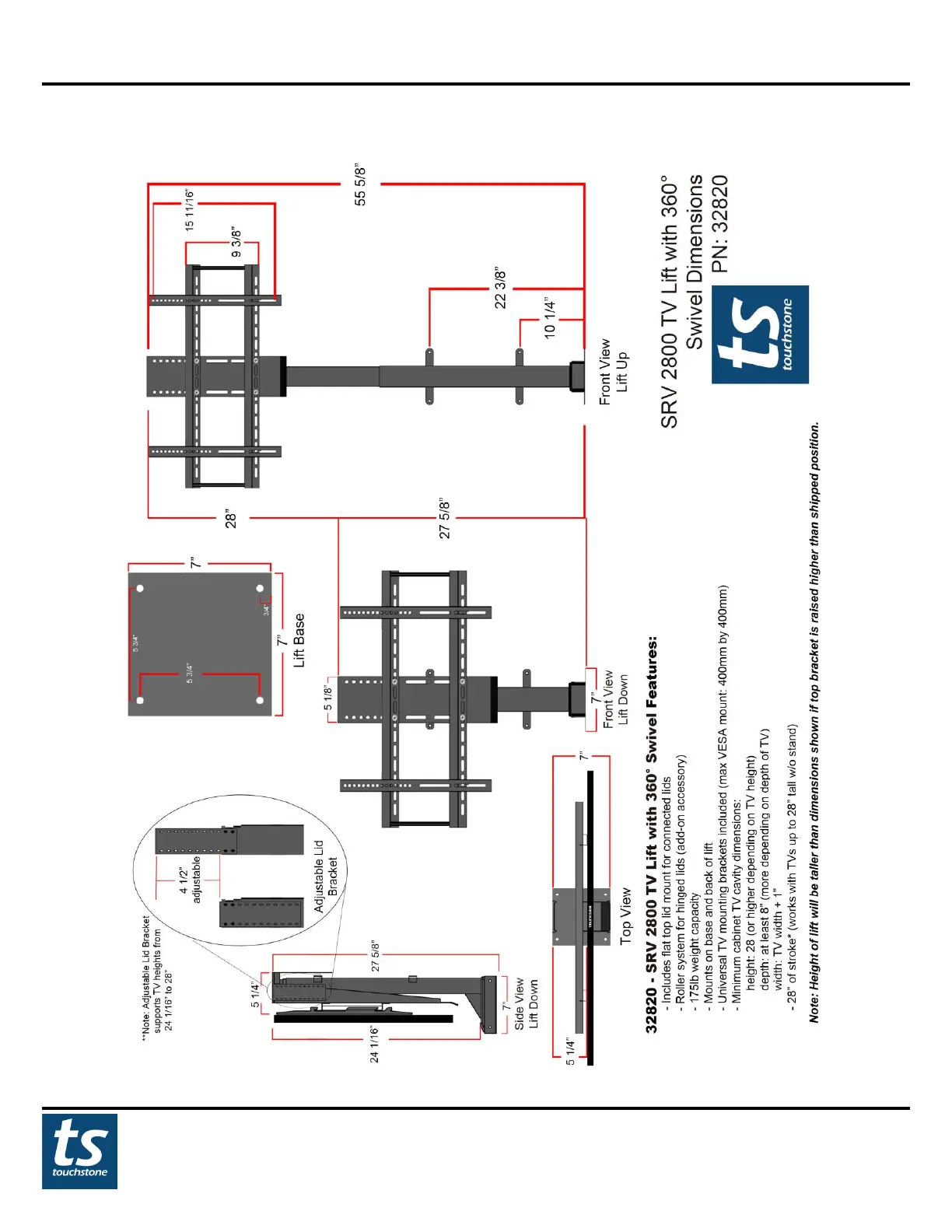 Touchstone SRV 2800 Pro - Dimensional Drawings; 32820 - 2800 SRV PRO 360-Degree Swivel TV Lift