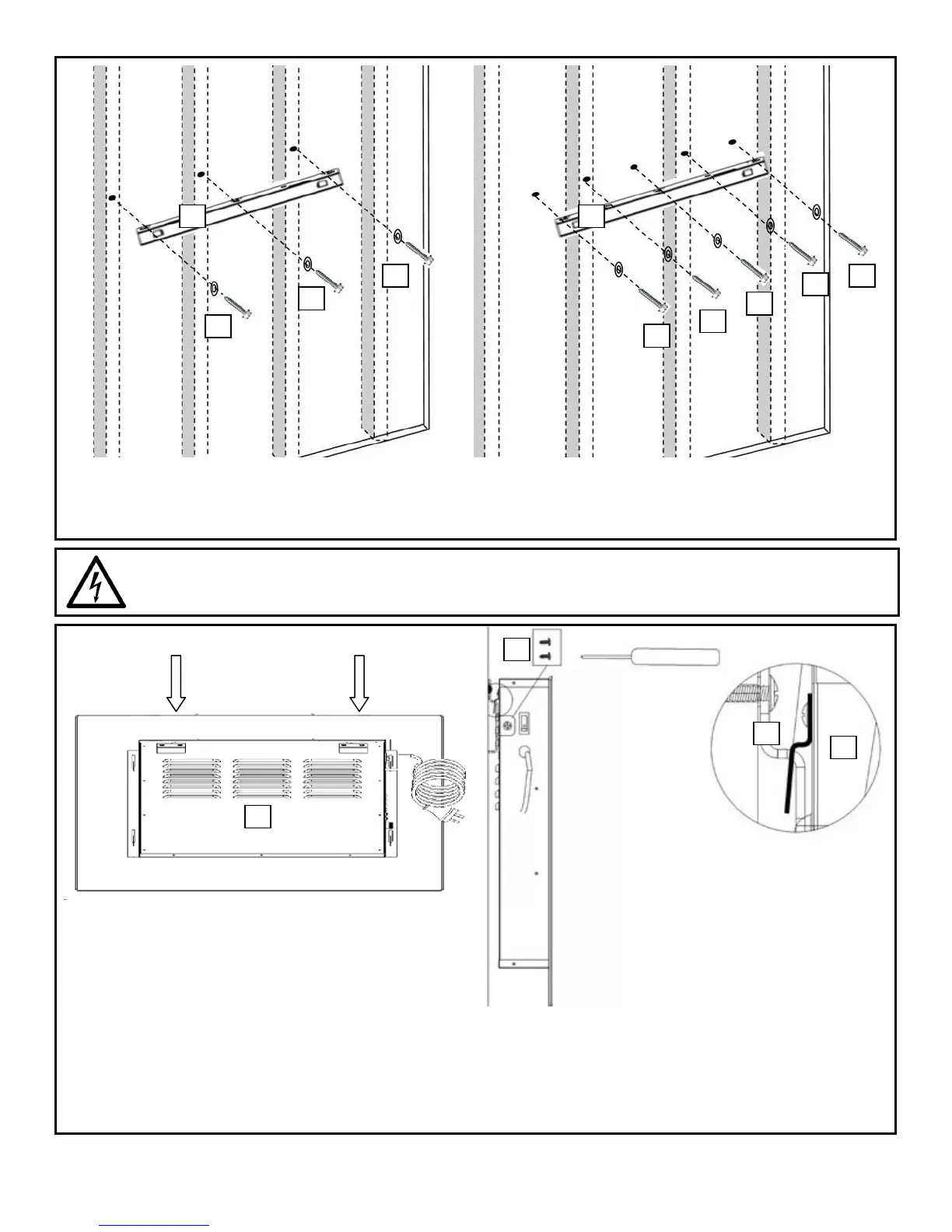 B. Secure the fireplace to the wall bracket with two M4x8 metal screws (D), one on each side.