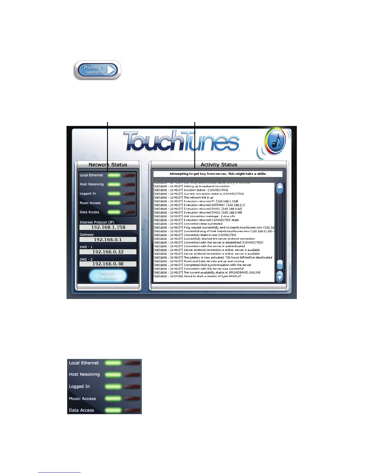 communicate with the TouchTunes server. Network status LED indicators display the success