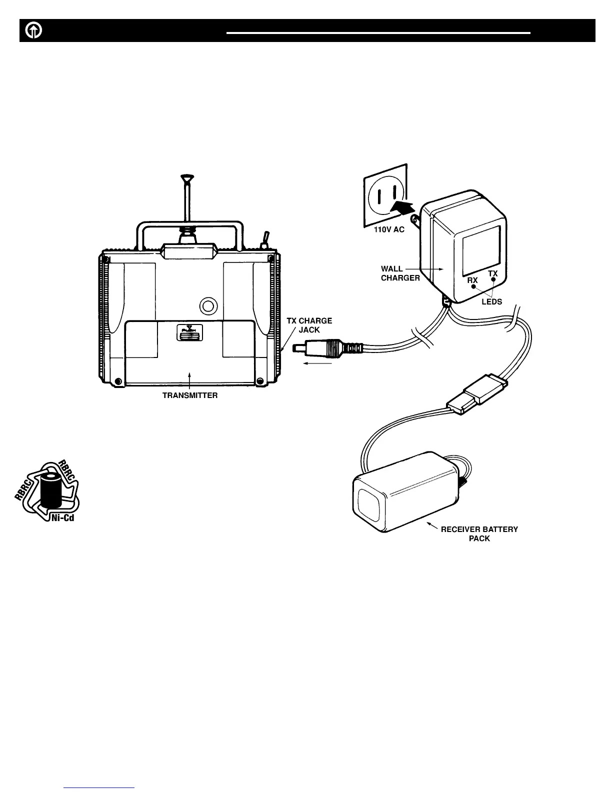 er into a 110V AC wall outlet. Next, connect the charger’s output leads to the Rx battery pack and Tx charge jack. The
