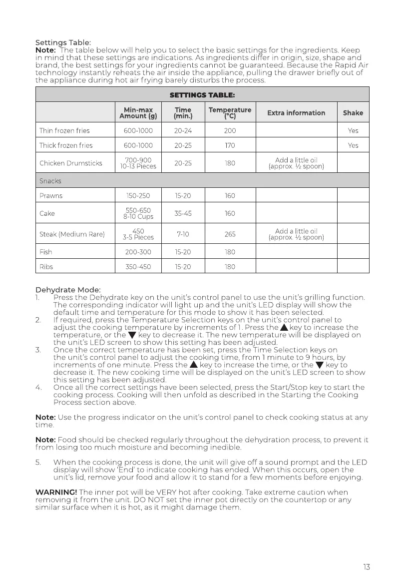Tower Hobbies T17086 - Dehydration Mode and Settings; Dehydrate Mode Operation Guide; Extended Ingredient Settings Table
