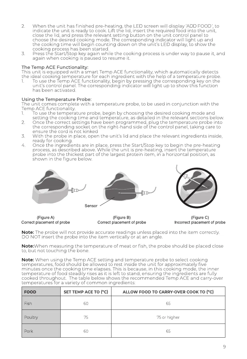 Tower Hobbies T17086 - Advanced Cooking Functions; Temp ACE Automatic Temperature; Using the Temperature Probe Correctly