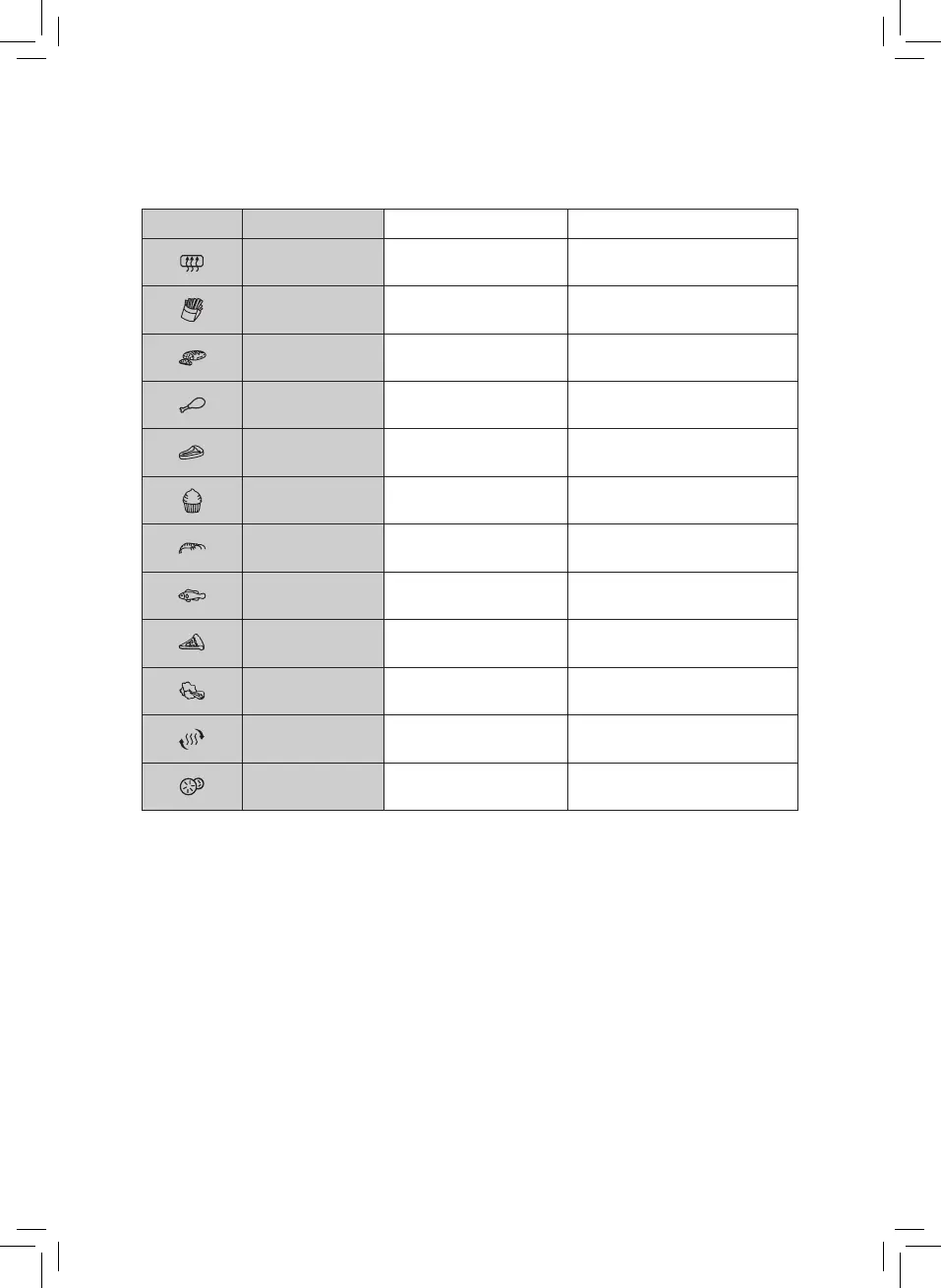 The table below shows the pre-set times and cooking temperatures for each of the unit’s