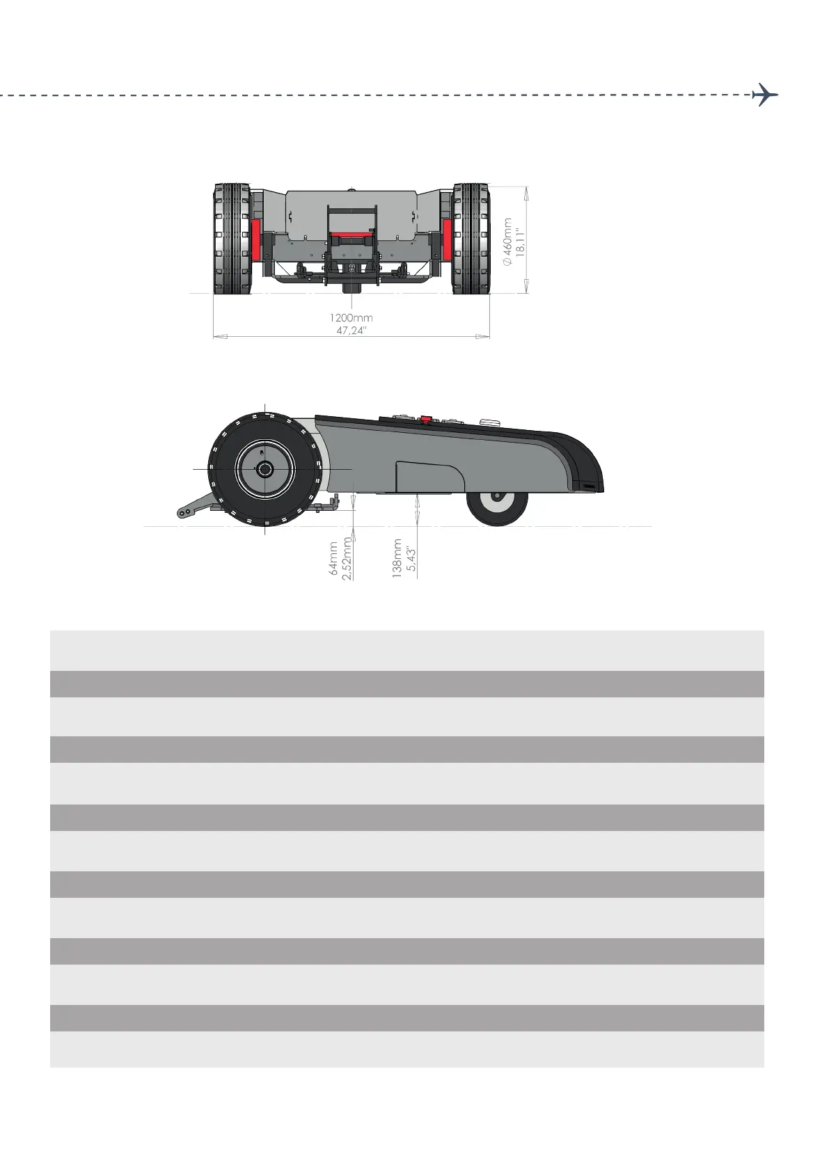 1.050 mm (41,34”) Antriebsräder, ein Stützrad in der Mitte