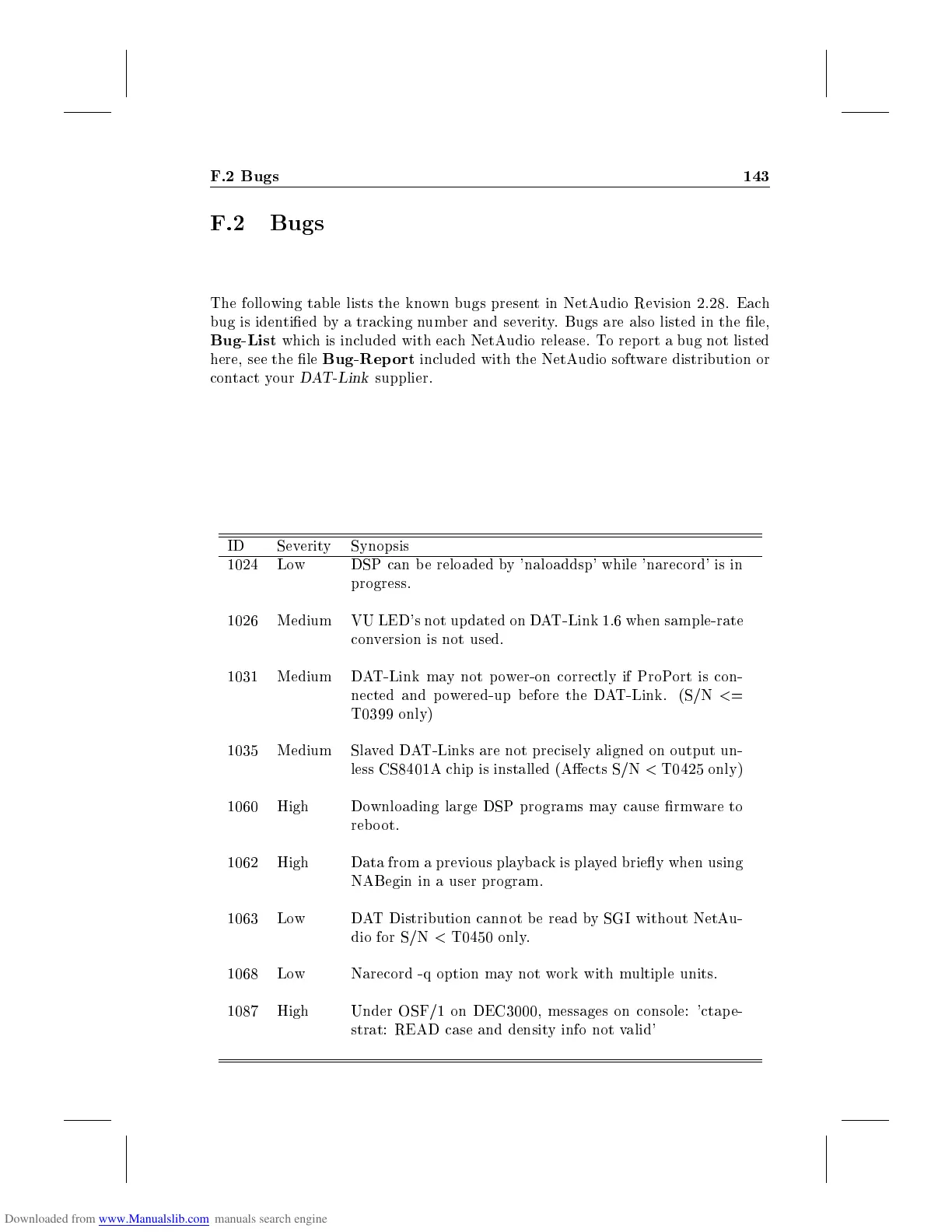 The following table lists the known bugs present in NetAudio Revision 2.28. Each