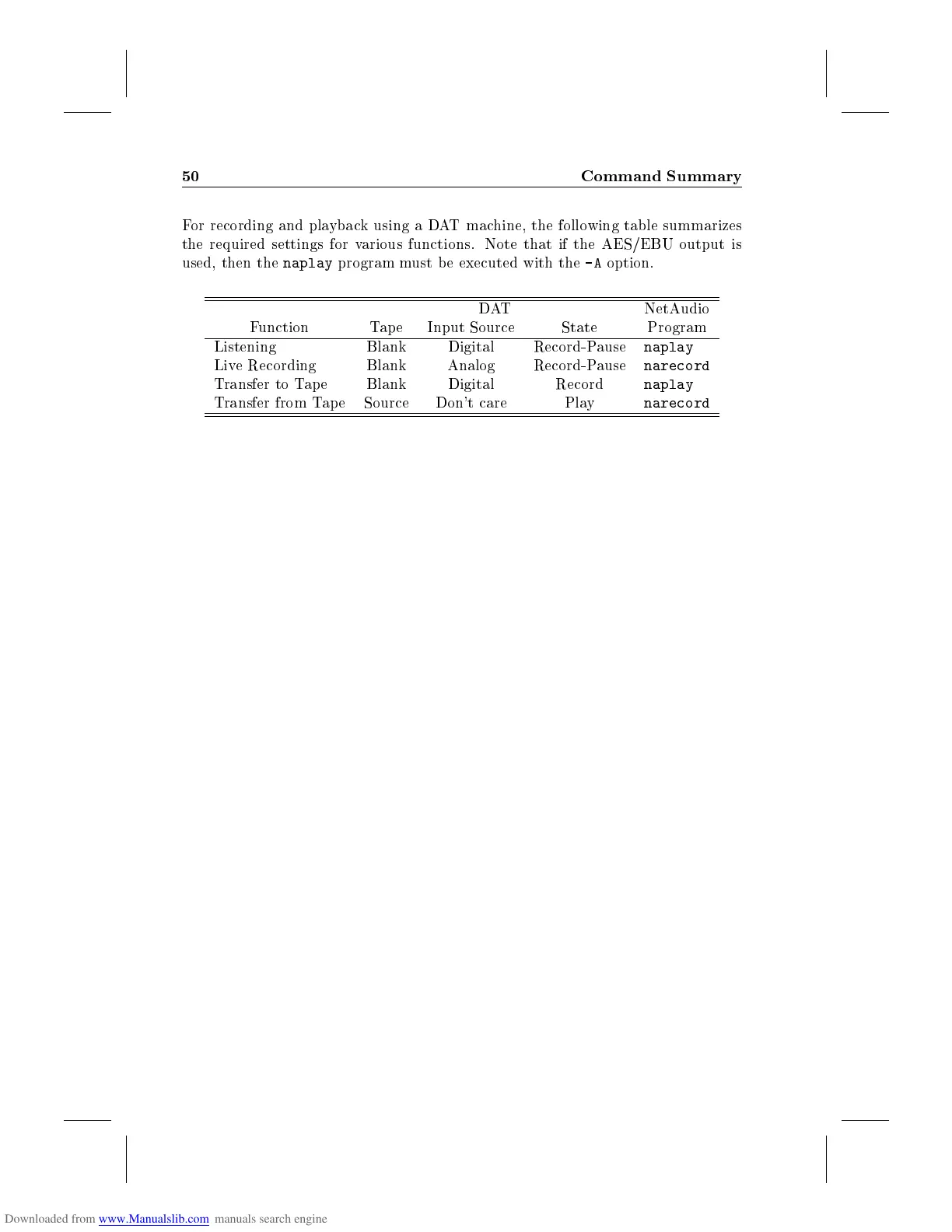 For recording and playback using a DAT machine, the following table summarizes