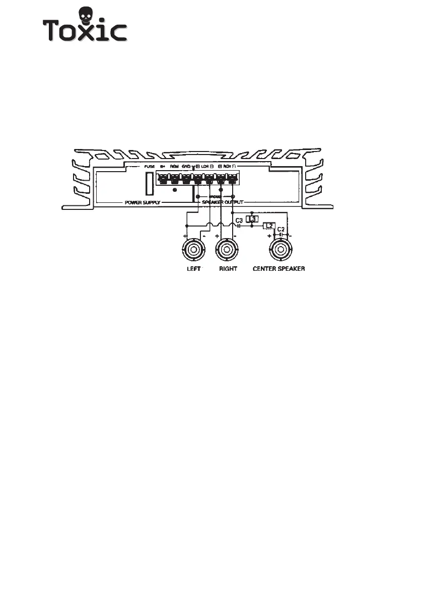 Tri-mode with center loudspeaker for 2-channel amplifiers: