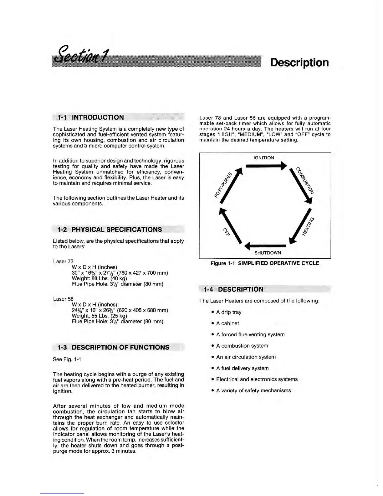 Toyostove Laser 56 E - Section 1 Description; 1-1 Introduction; 1-2 Physical Specifications; 1-3 Description of Functions