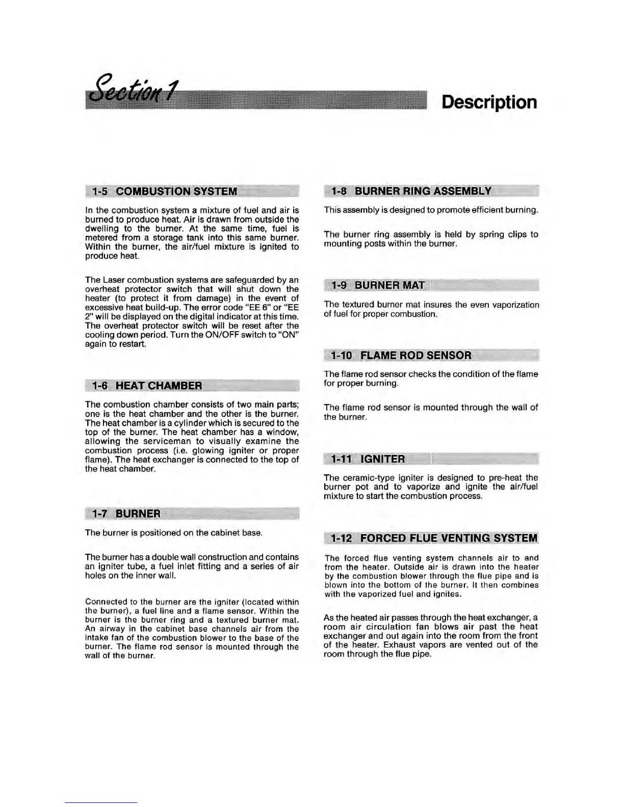 Toyostove Laser 56 E - 1-5 Combustion System; 1-6 Heat Chamber; 1-7 Burner; 1-8 Burner Ring Assembly