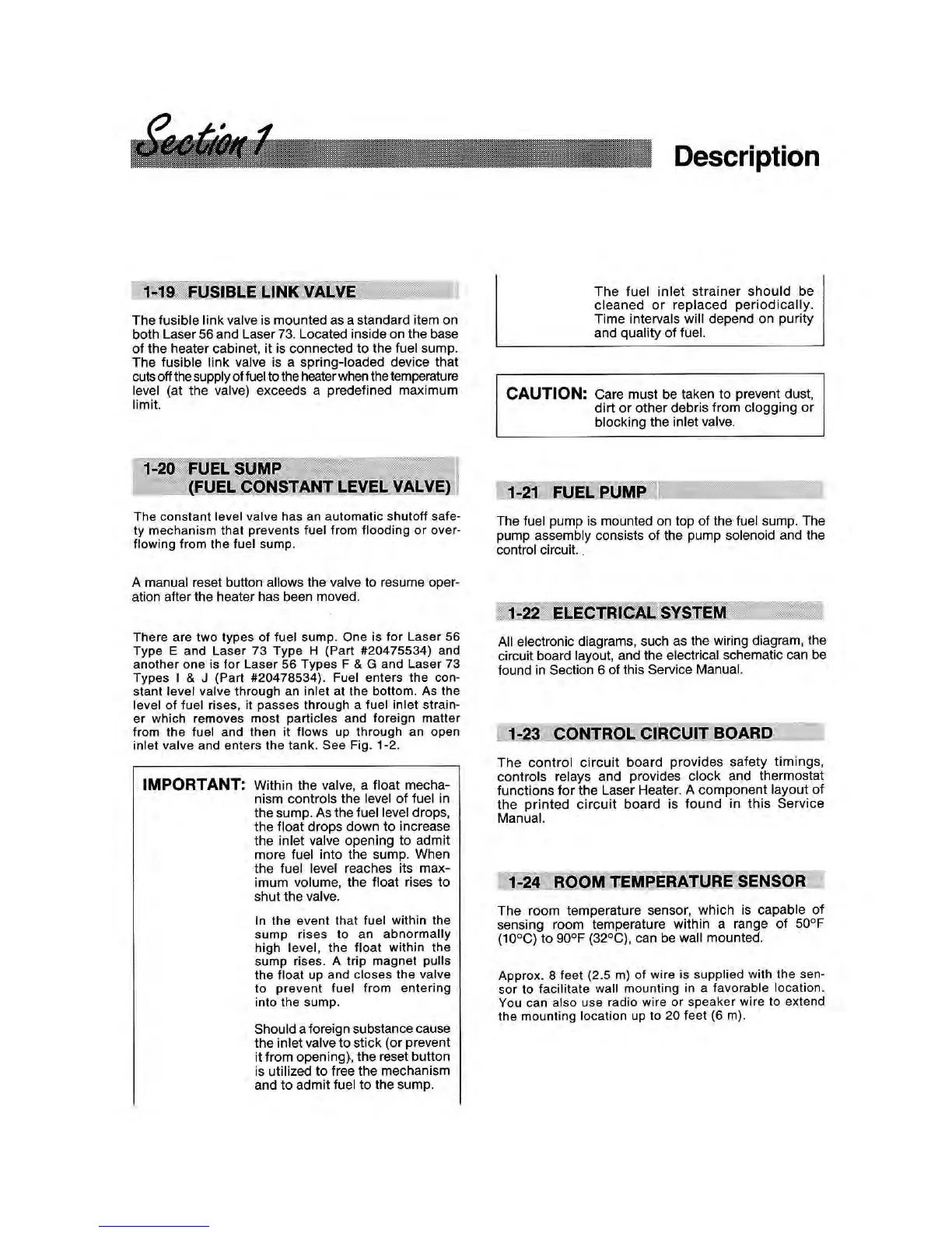 Toyostove Laser 56 E - 1-19 Fusible Link Valve; 1-20 Fuel Sump; 1-21 Fuel Pump; 1-22 Electrical System