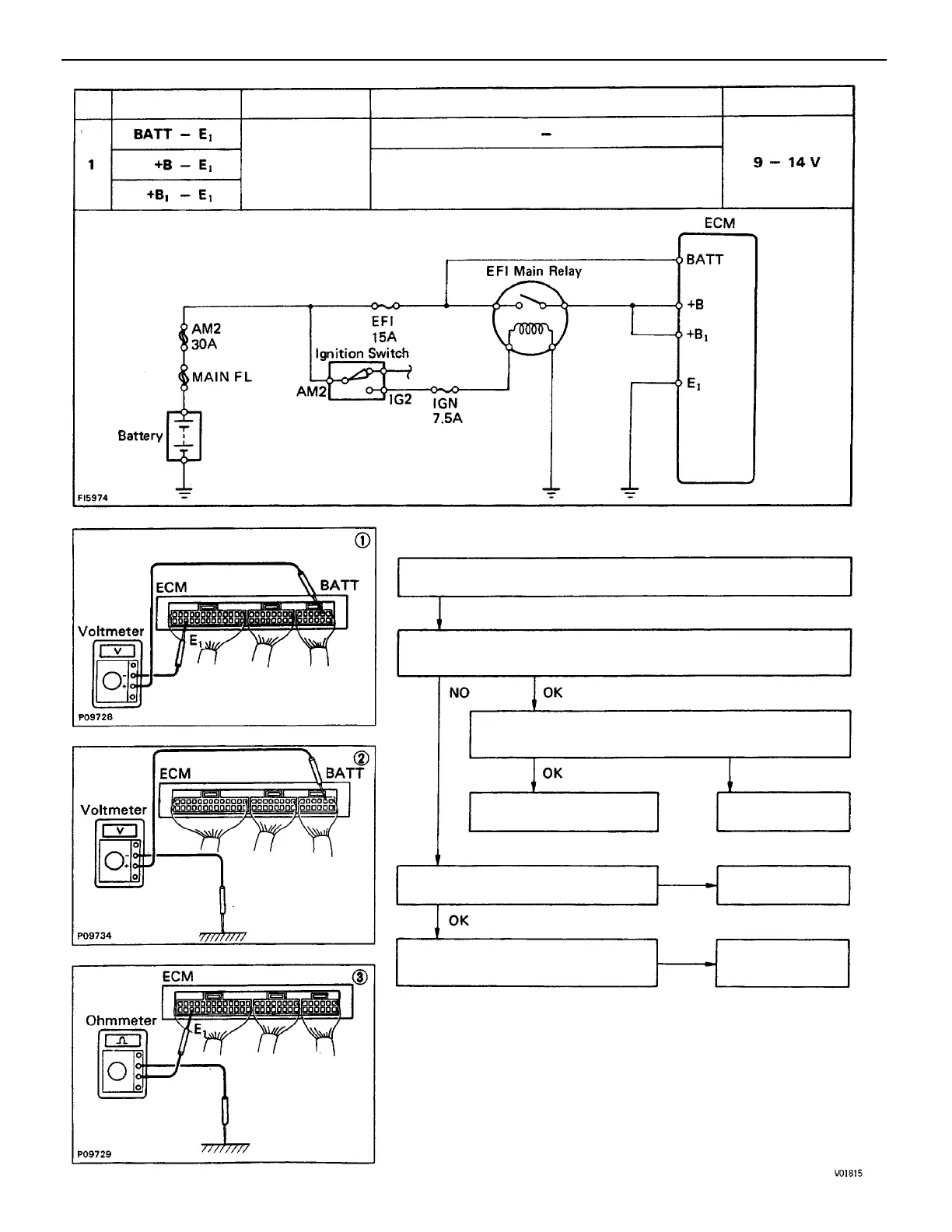 (1) There is no voltage between ECM terminals BATT and E1.