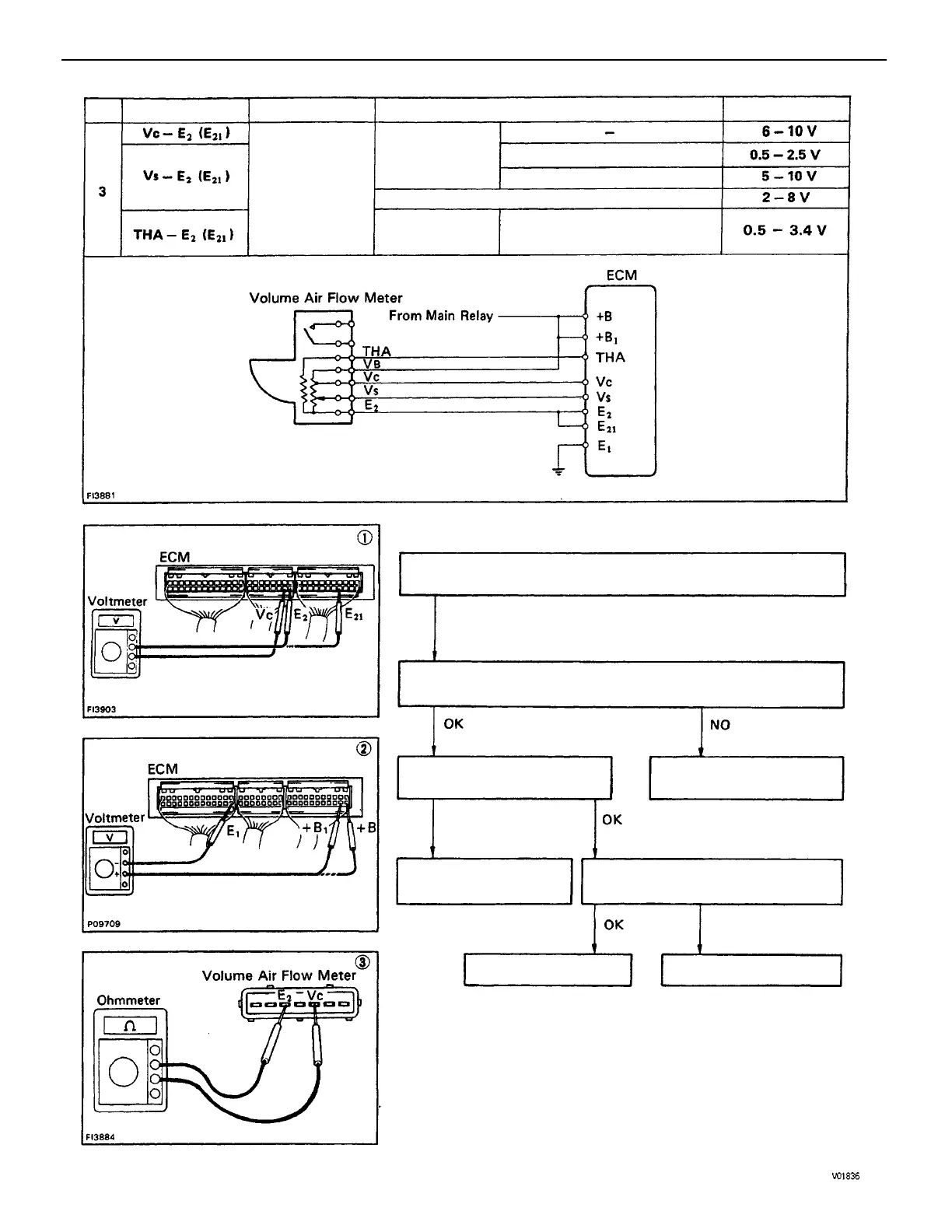 (1) There is no voltage between ECM terminals Vc and E2 (E21).