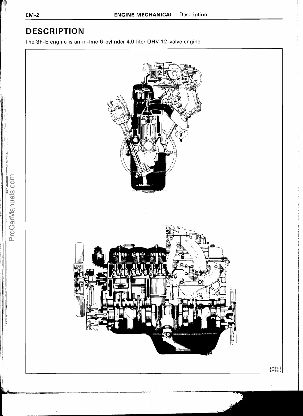 The 3F-E engine is an in-line 6-cylinder 4.0 liter OHV 12-valve engine.