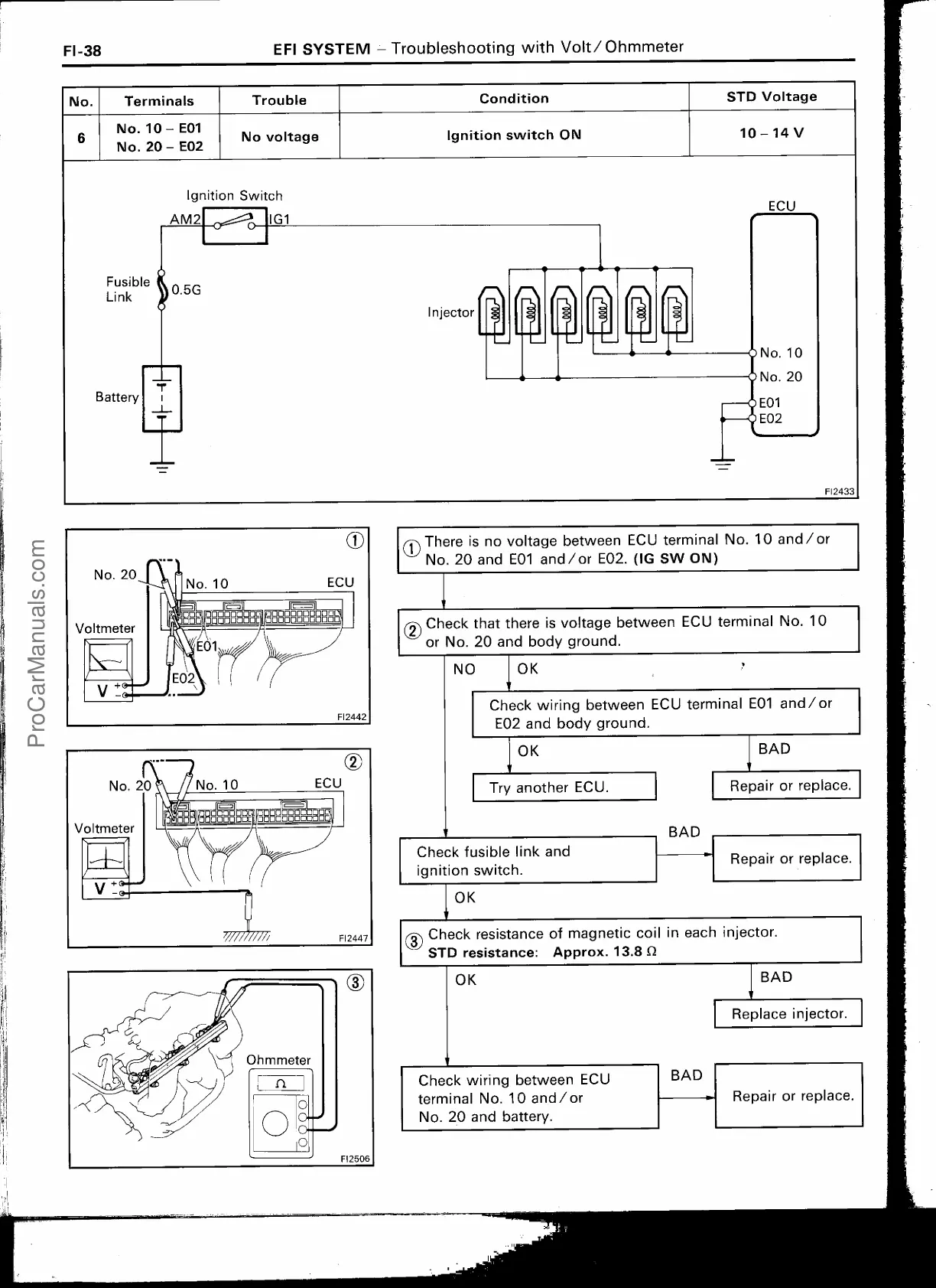 There is no voltage between ECU terminal No. 10 and/or