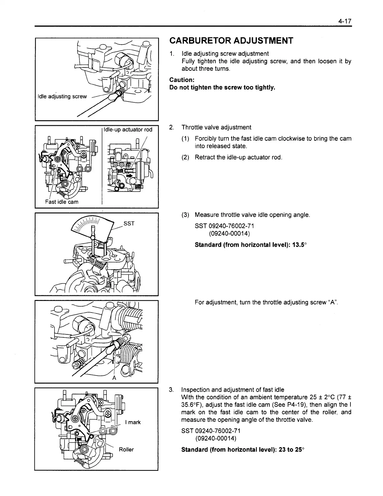 35.6"F), adjust the fast idle cam (See P4-19), then align the I