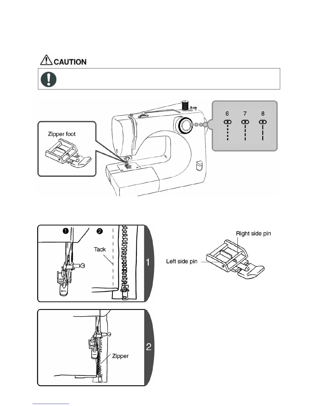 1. Set the zipper foot to the right side pin.