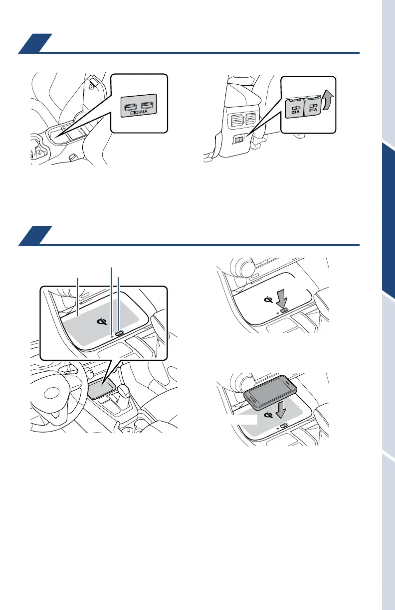 A mobile device can be charged wirelessly on the tray. (1) Press the wireless