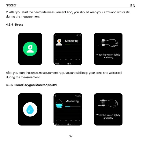 TOZO S2 - 4.3.4 Stress Measurement; 4.3.5 SpO2 Measurement