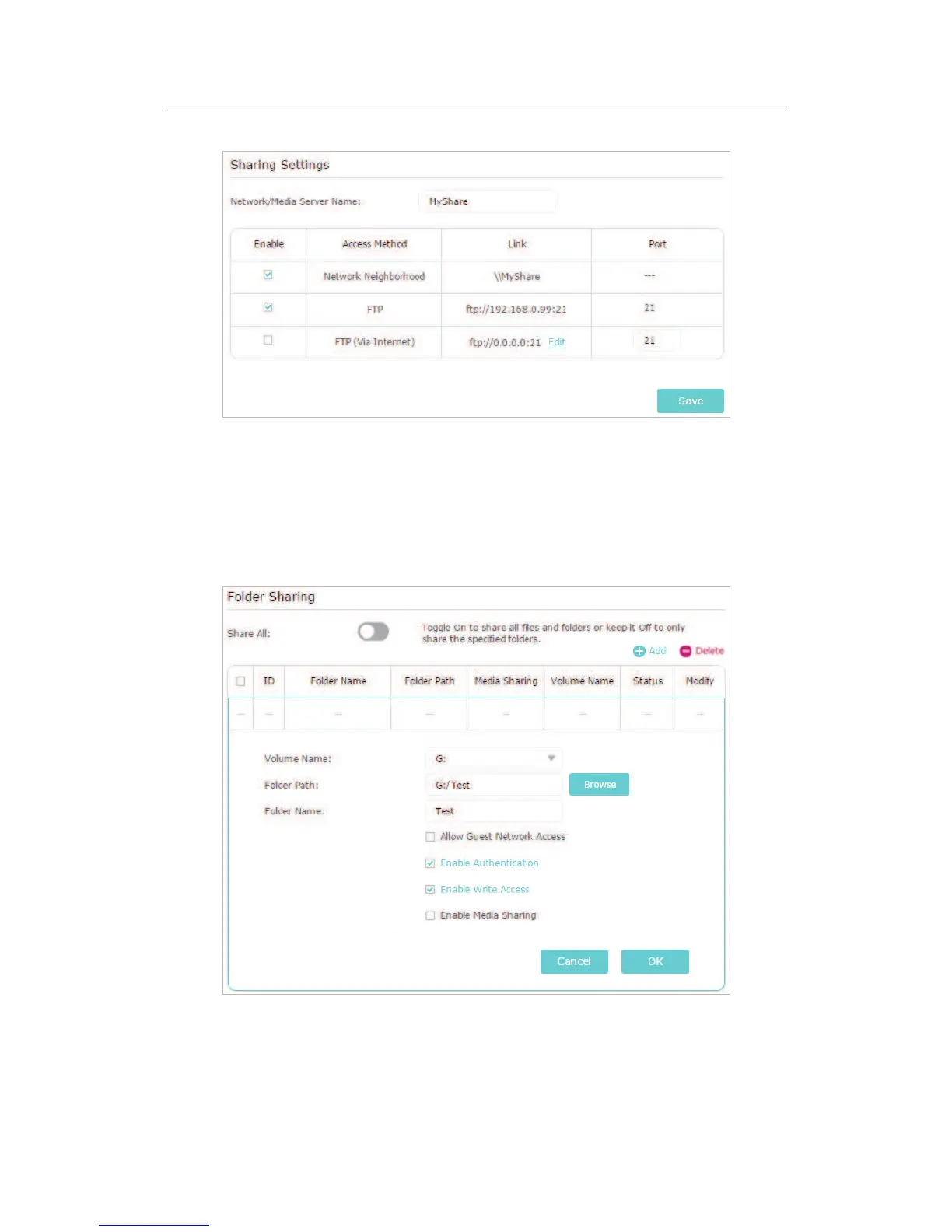 Add to add a new sharing folder.