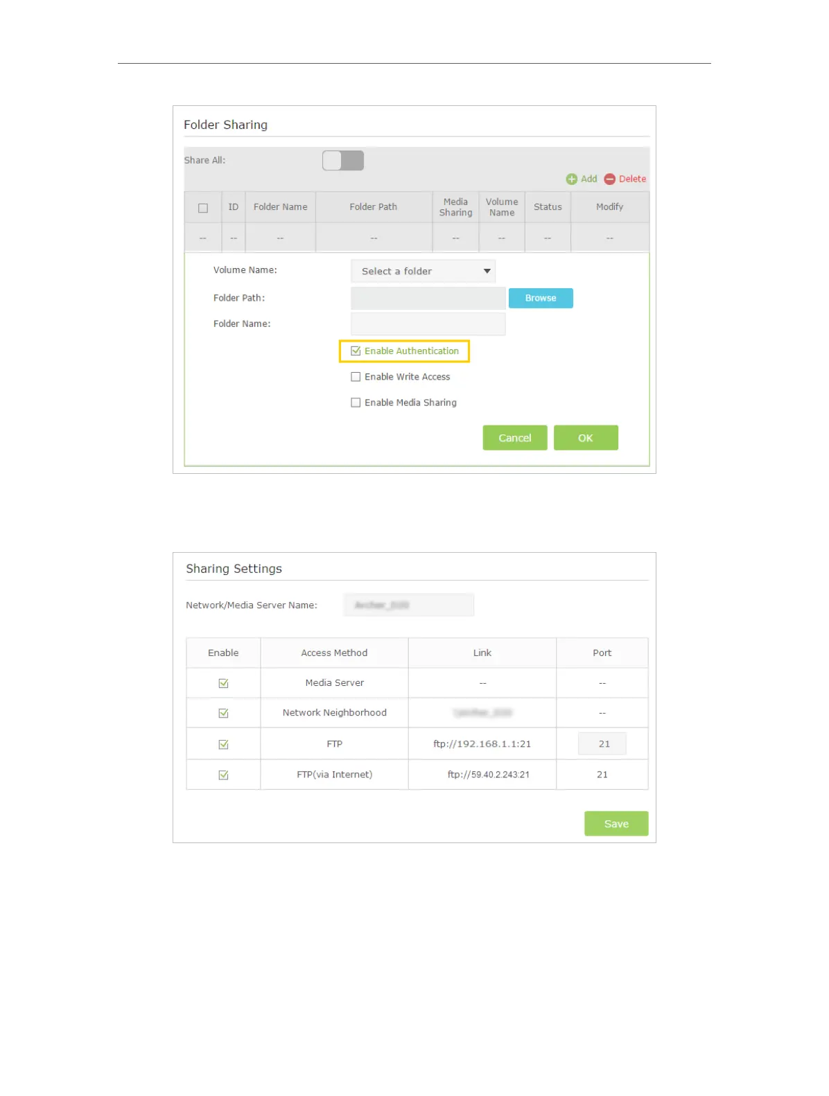 Select the check box to enable FTP(via Internet), then click Save.