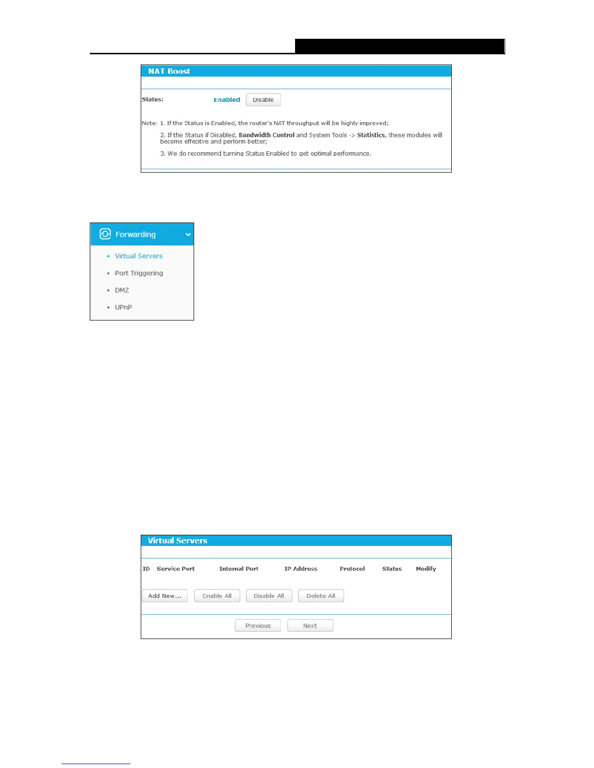There are four submenus under the Forwarding menu: Virtual Servers, Port Triggering, DMZ