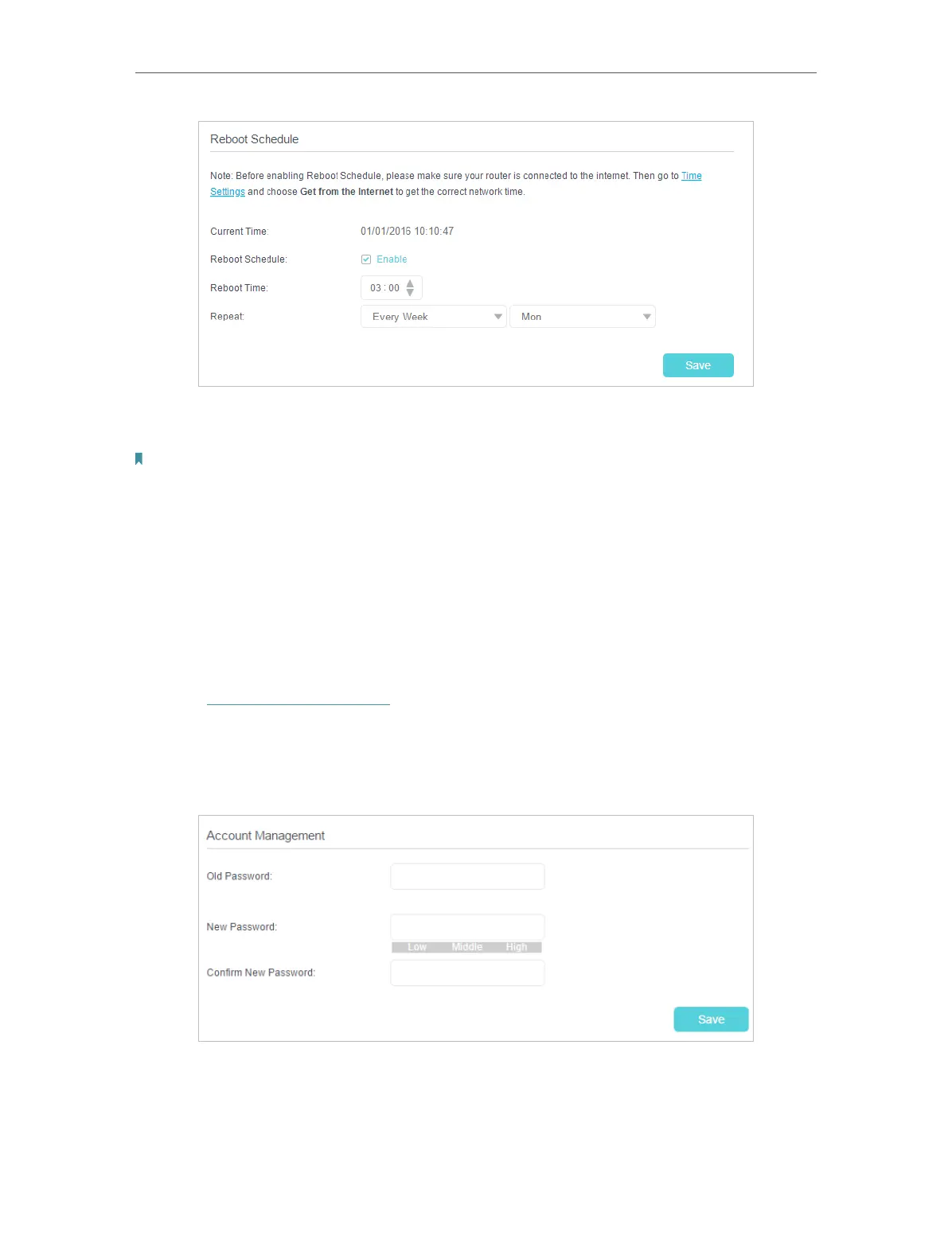2. Specify the Reboot Time when the router reboots and Repeat to decide how often