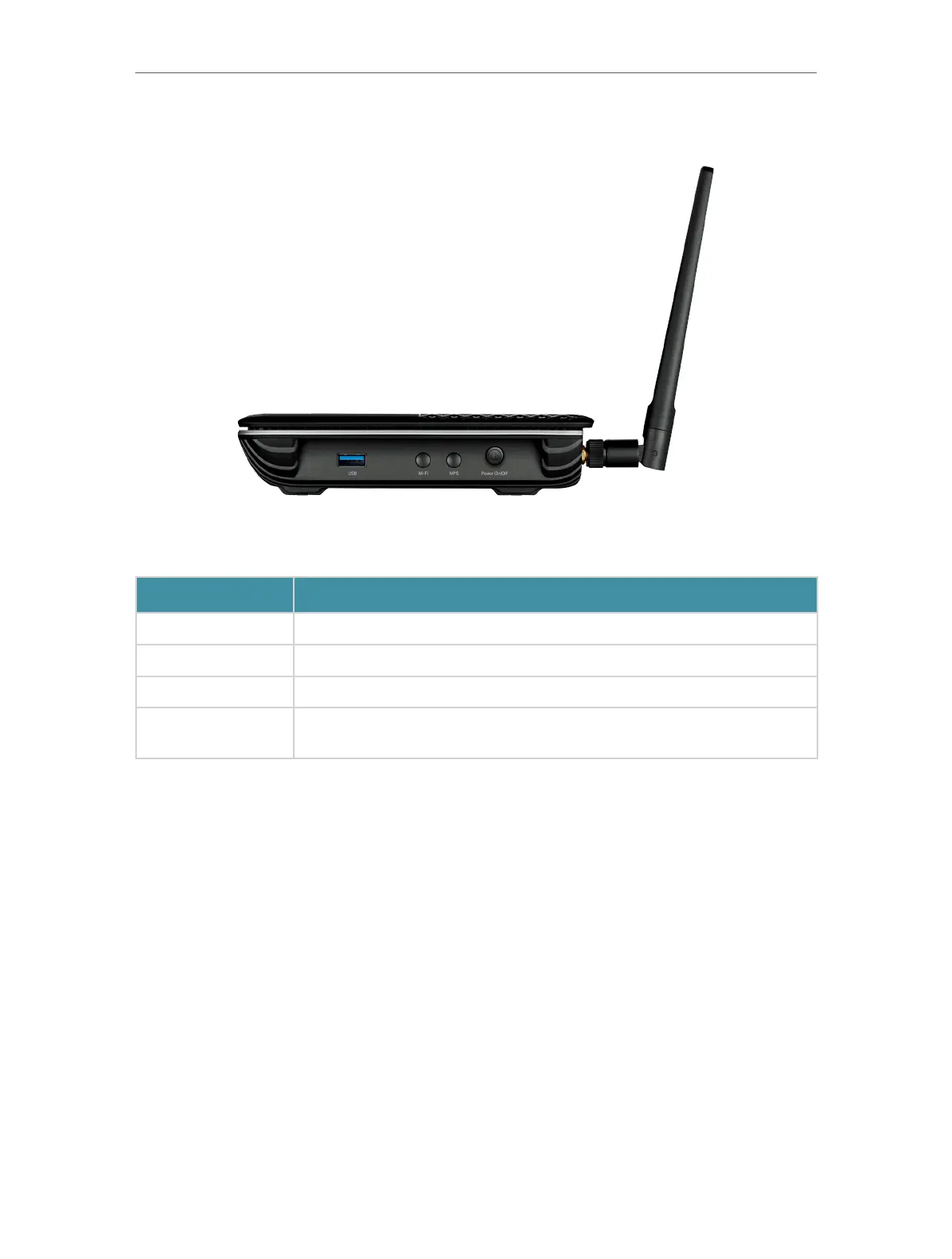The modem router’s side panel shows the buttons and ports. Refer to the following for